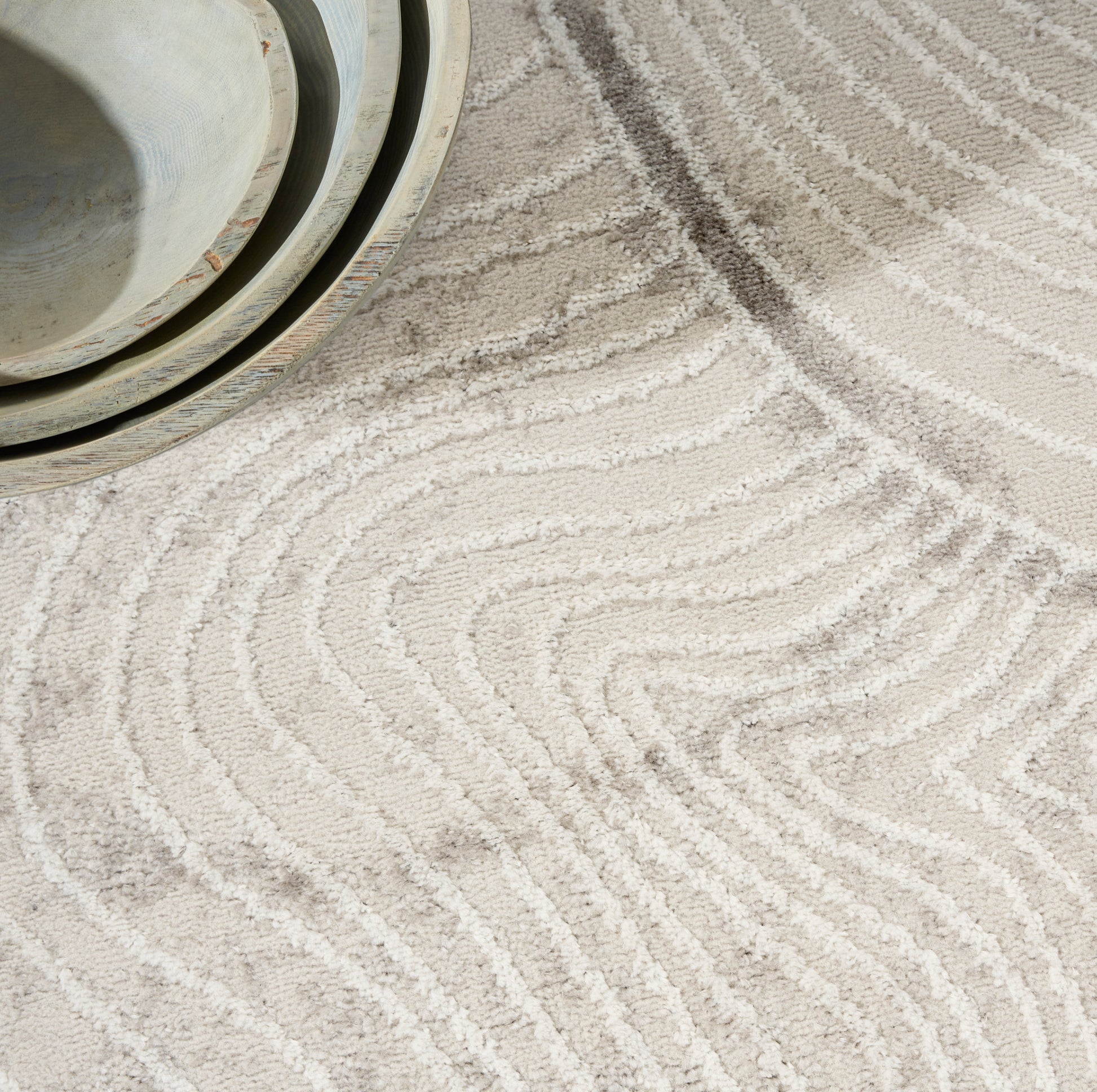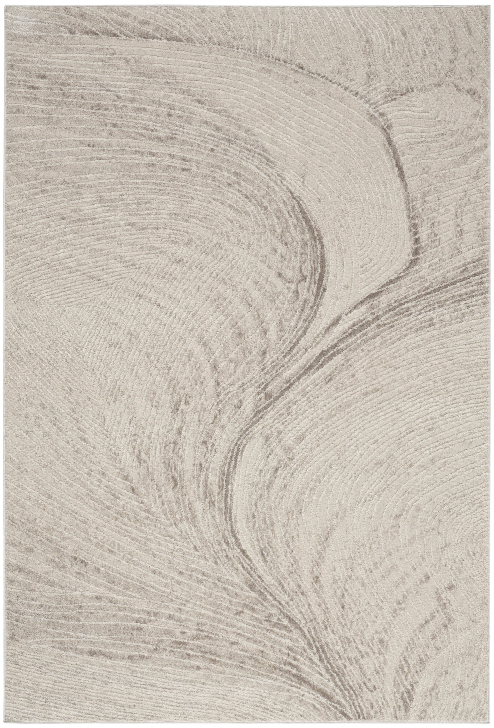 Elevate your space with this abstract rug from the Calvin Klein Captivating Collection. The free-flowing pattern is layered with a delicately veined tonal pattern that creates a stunning sense of movement. Presented in a simple yet striking ivory and grey palette. Machine-made from a durable blend of polyester and polypropylene.