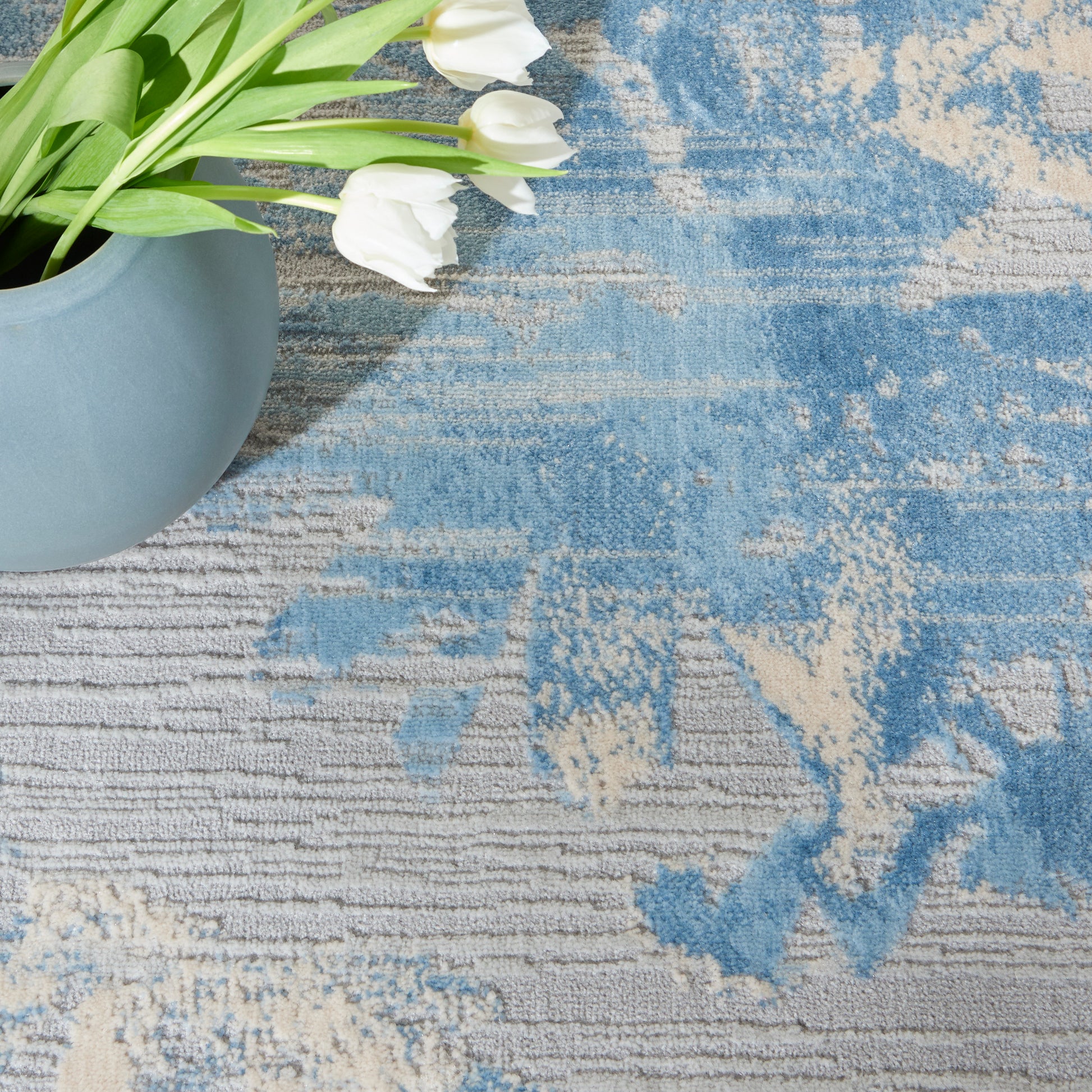 This masterful design from the Calvin Klein Enchanting Collection adds a modern sensibility to the contemporary home. In soft tones of grey and sky with a high-low cut pile, this abstract floral rug brings textural interest into your living space. A unique choice for your living room, bedroom, or home office in an easy to clean, modern fiber blend.