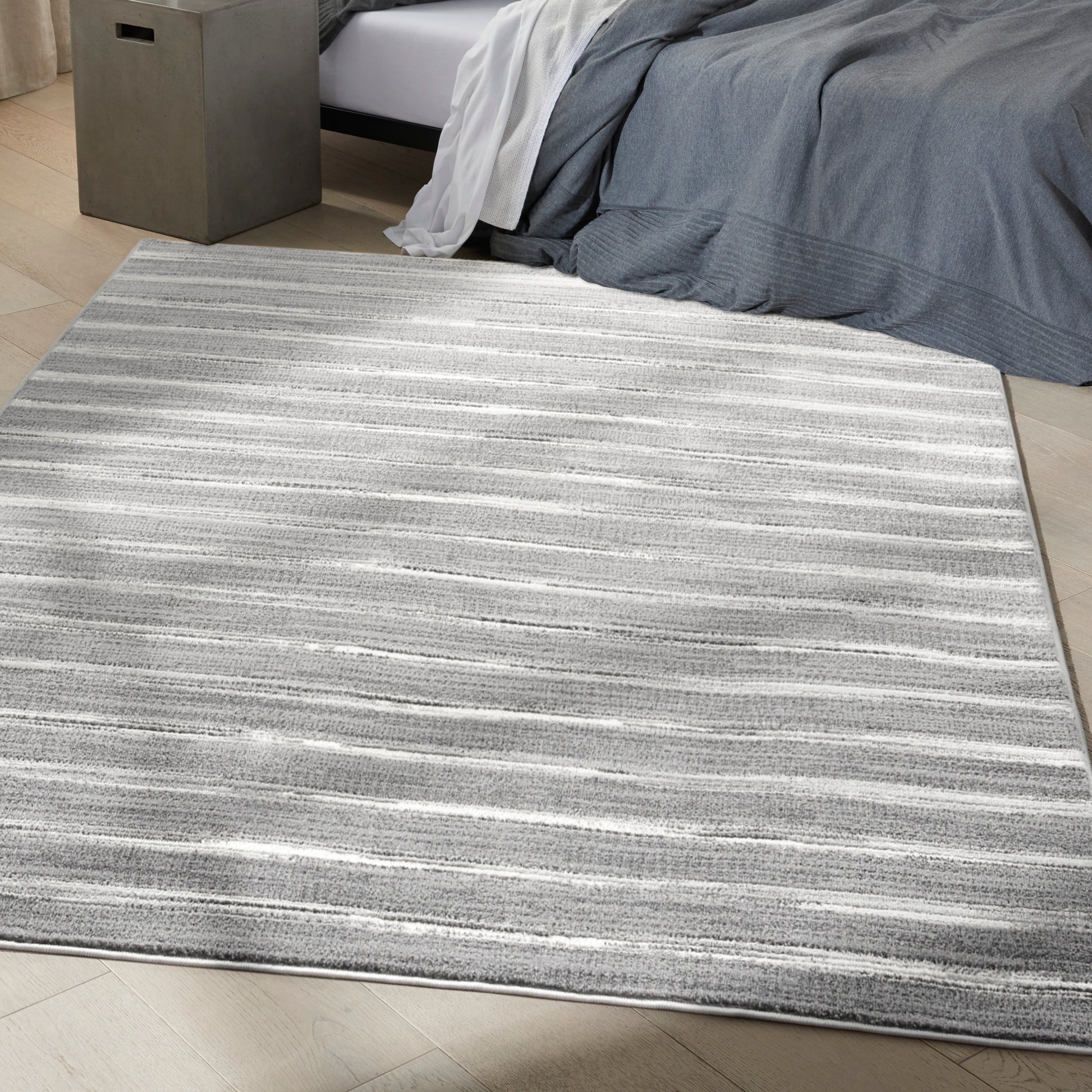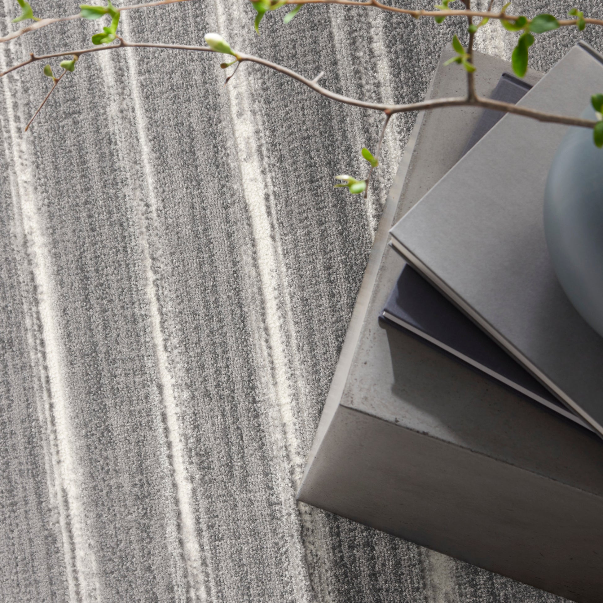 This geometric rug from the Calvin Klein Verdant Collection delivers subtle sophistication through its broken stripe pattern and space-dyed tonal variations. Machine-made of soft, easy-clean polyester.