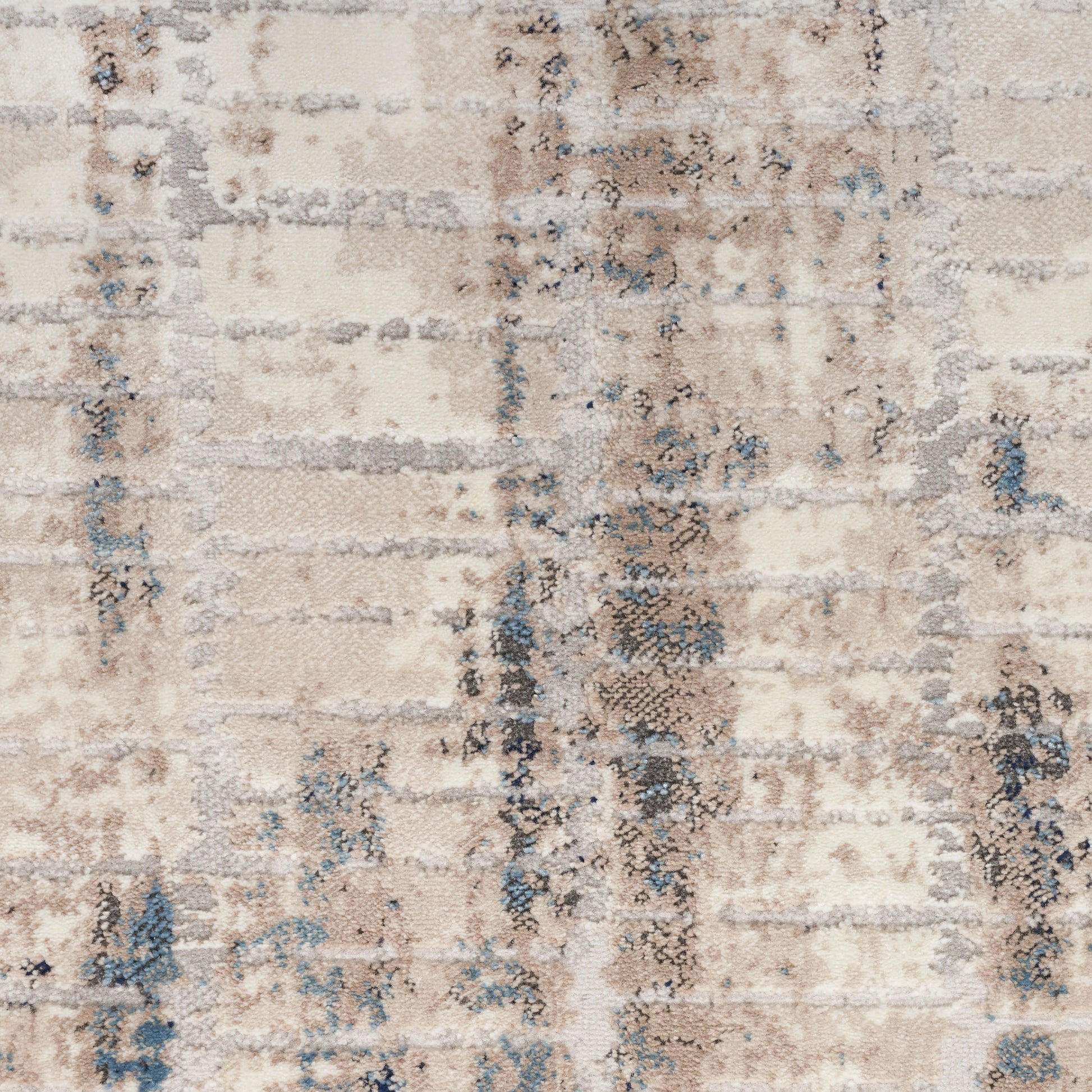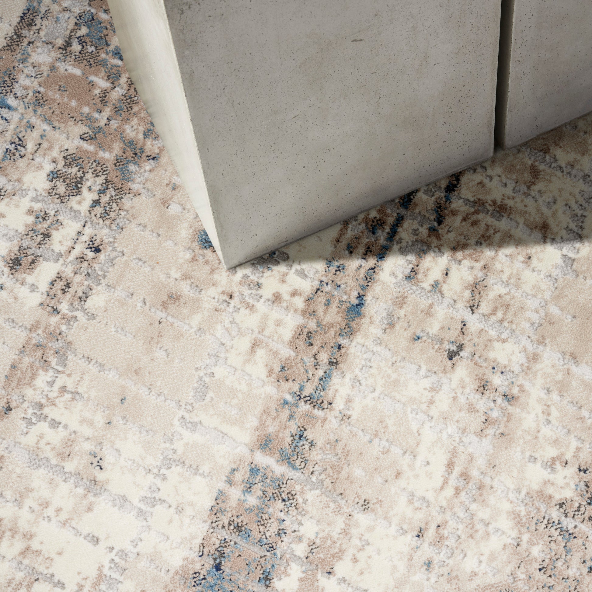 A sense of calm. The new abstract rug from the Calvin Klein Infinity collection. The softly textured surface beautifully balances a neutral color palette of grey, blue, and ivory with a raw, nature-inspired pattern. Machine-made for lasting style from softly textured, easy-clean fibers.