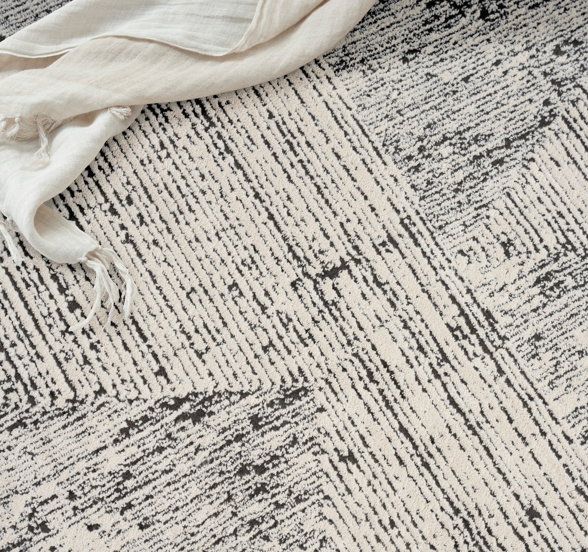 This abstract rug from the Calvin Klein Irradiant Collection brings minimalist energy to your home. An overlapping linear pattern, presented in cream and black tones, is enhanced by subtle texture variations and a vivid sheen. Machine-made from polyester for modern living.