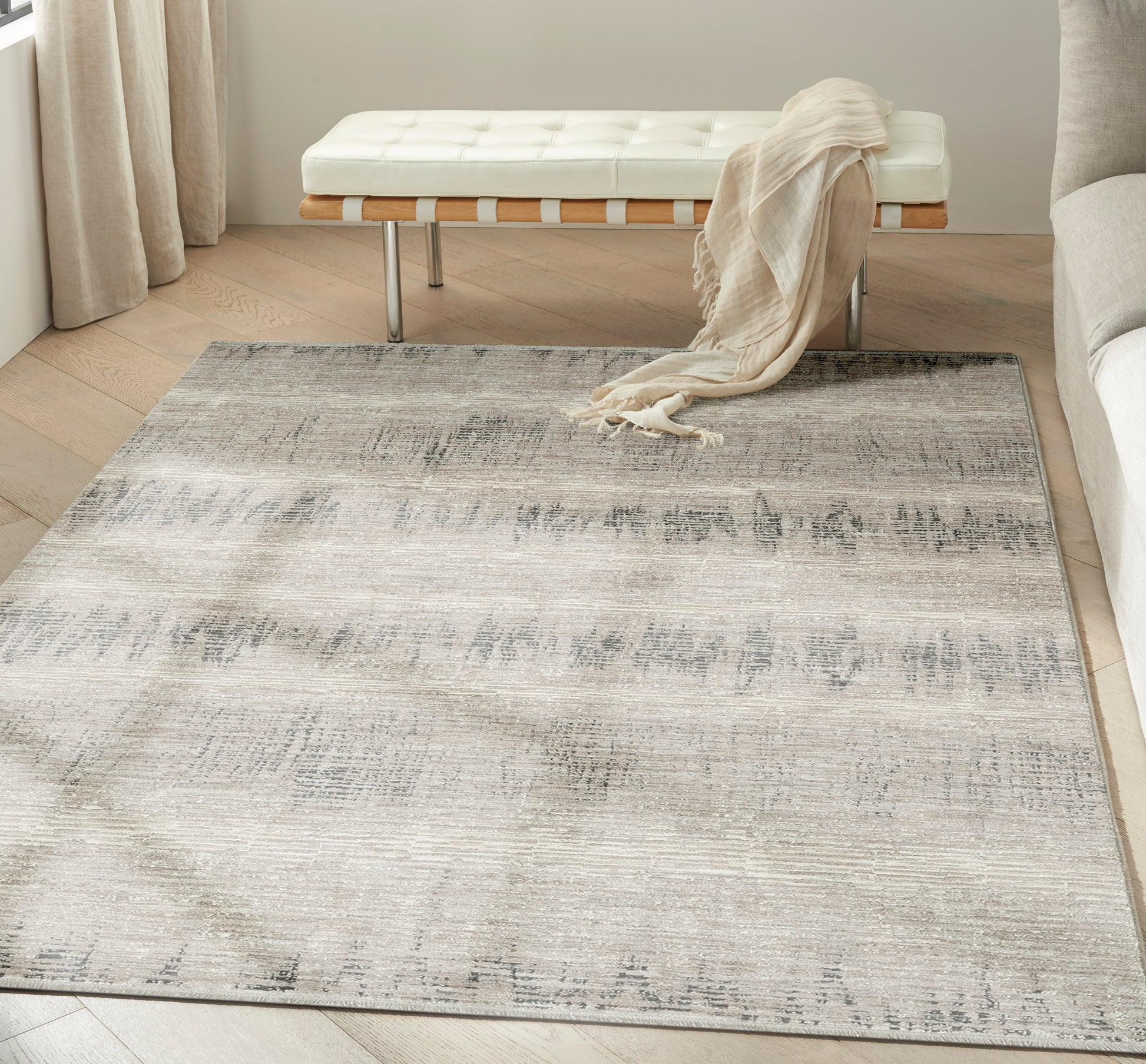 Invite cool, refined energy to your décor with this charcoal grey abstract rug from the Calvin Klein Notes collection. The irregular stripe design is overlaid with a subtly distressed finish that adds depth and visual appeal to modern spaces. Made from 100% polyester for easy care.