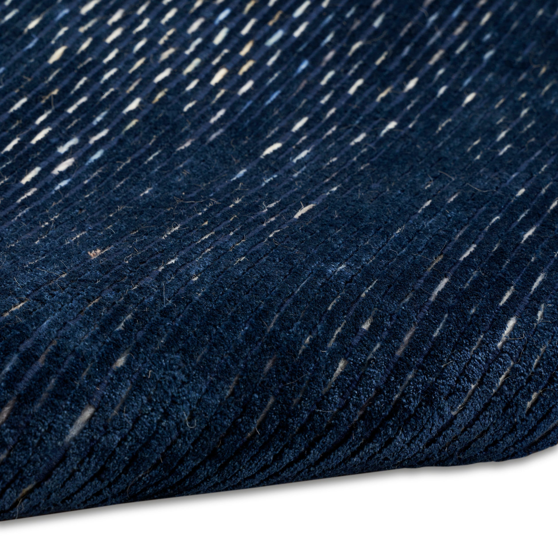 This modern blue rug from the Calvin Klein Valley Collection adds a simple yet striking look to any space. The silky-smooth pile is interwoven with banded high-low yarns that add a subtle sense of depth. Handmade with wool and viscose fibers that add a captivating sheen.