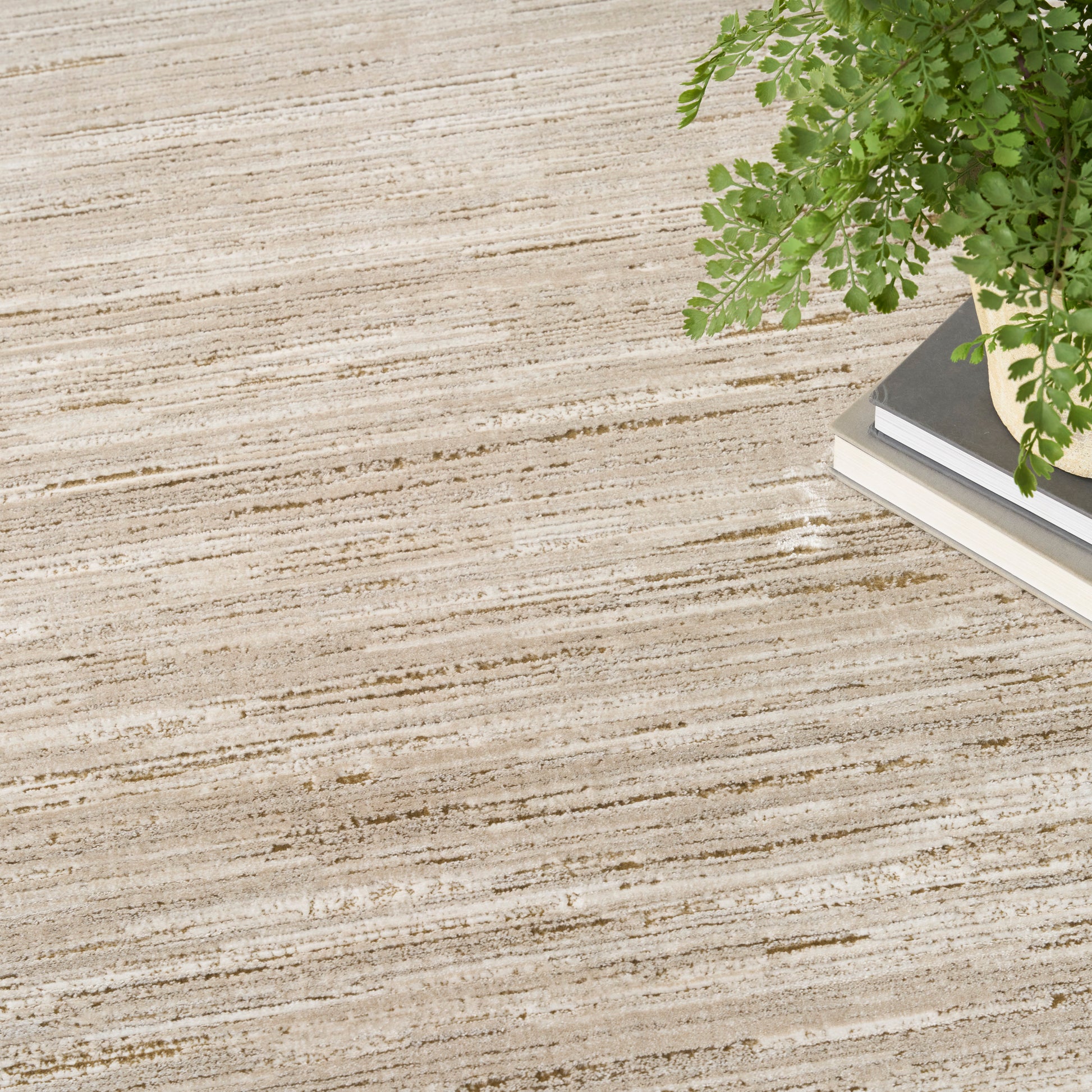 Modern and understated, this abstract taupe and ivory rug from the DKNY Grand Street collection features a tonal linear pattern that creates a subtle ombre effect. A silk-like sheen adds a soft glow, while the low-profile, easy-care construction makes it ideal for everyday living.