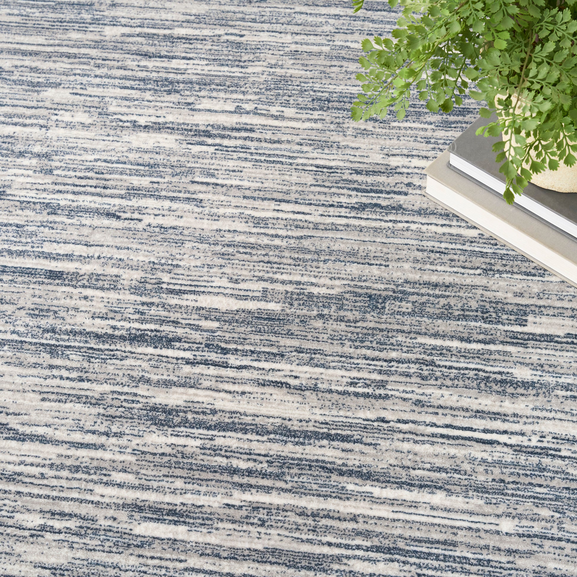 Add dimension to your space with this abstract blue and ivory rug from the DKNY Grand Street collection. The hazy linear design features tonal variations and a soft, silk-like sheen that catches the light. Finished in a low-profile, easy-care construction that fits seamlessly into modern interiors.