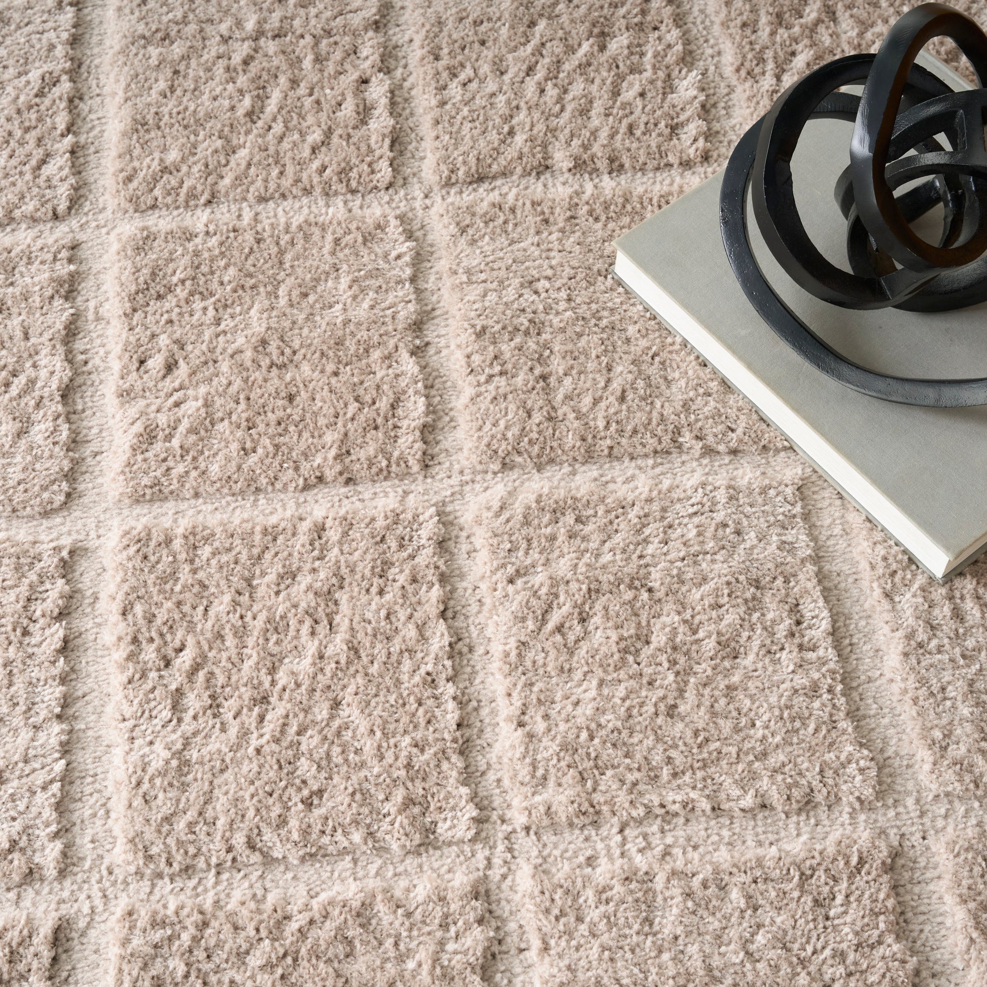 Equal parts cozy and refined, this beige shag rug from the DKNY West End Ave collection brings relaxed style to your space. The classic checkerboard pattern is enhanced with a dimensional high-low weave that has a luxurious texture.