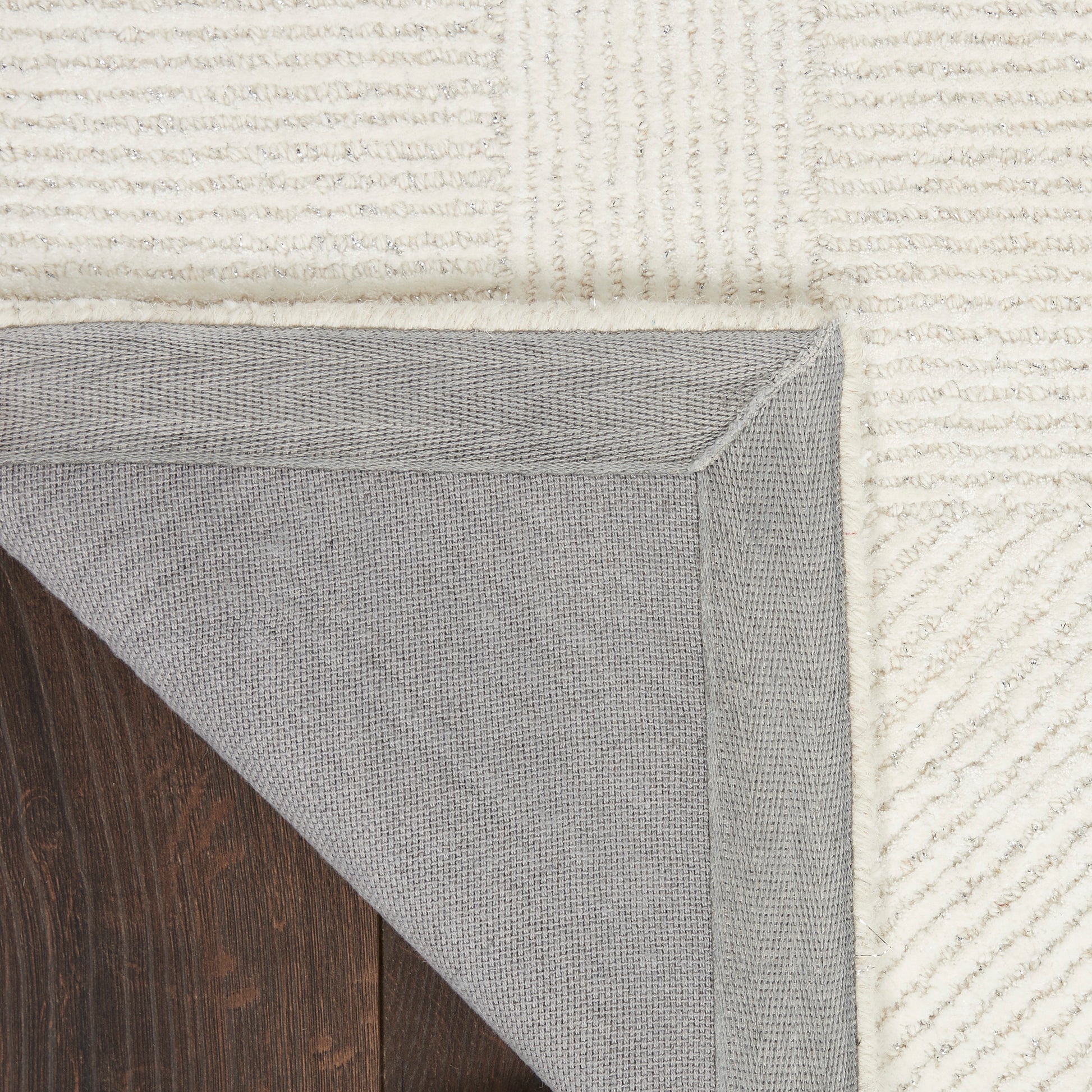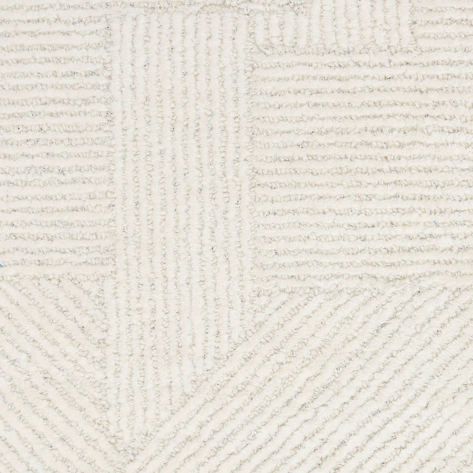 Crafted in bold abstract style, this modern rug from the Michael Amini Star Collection by Nourison is a mesmerizing addition to your home décor. This statement making design showcases an overlapping linear pattern in pale ivory, enhanced by shimmering accents that shift beautifully with changes in light. Handmade in high-low style from a luxurious blend of wool, lurex, and silk-like Luxcelle fibers that feel wonderfully soft underfoot.