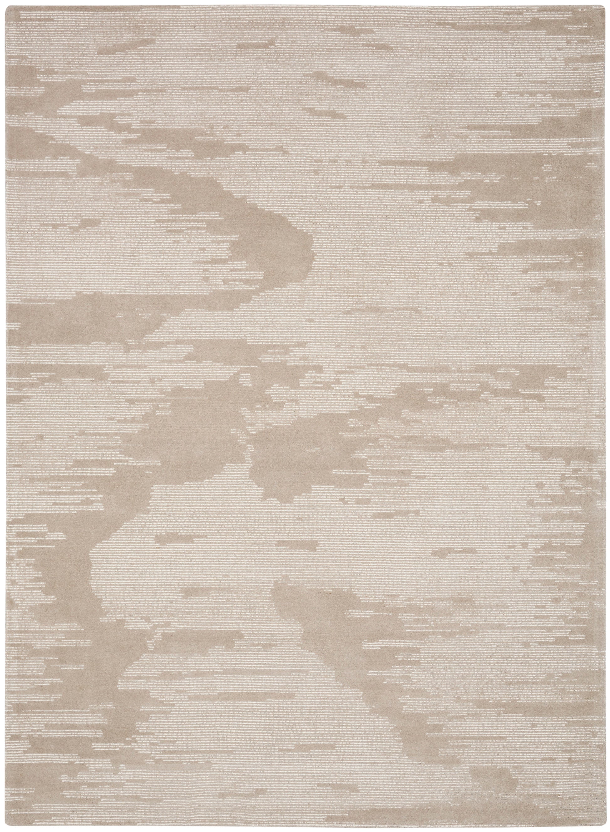 Inspire calm with this abstract rug from the Michael Amini Star Collection by Nourison. Its linear motif, presented in taupe and ivory, mimics the ebbs and flows of a hazy skyline, with subtle bursts of solid color designed to draw the eyes. Shimmering accents that shift with light create a sense of movement, adding a unique sense of depth to your living room or bedroom furnishings. Handmade in high-low style from a richly textured blend of wool, lurex, and silk-like Luxcelle fibers.