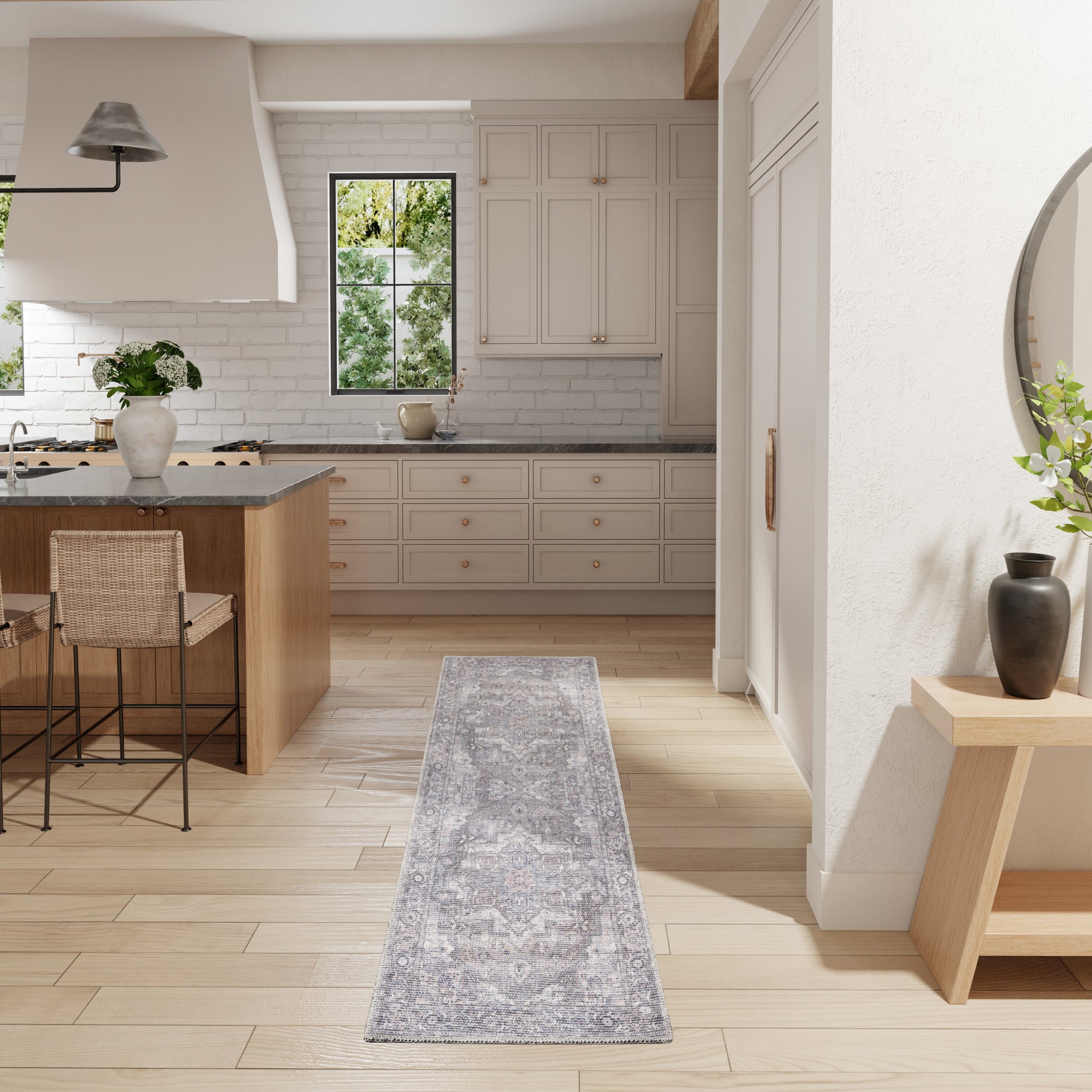 In a faithful nod to timeless Persian artistry, this boho rug from the Nicole Curtis Series 1 Washable Rug Collection features an intricately printed floral medallion design in soft shades of grey and beige. A modern heirloom for your home in a wonderfully soft blend of cotton and chenille, it’s finished with intentional distressing for that true vintage feel. This lightweight, flat woven rug is machine-washable and fits easily under furniture and near doorways.