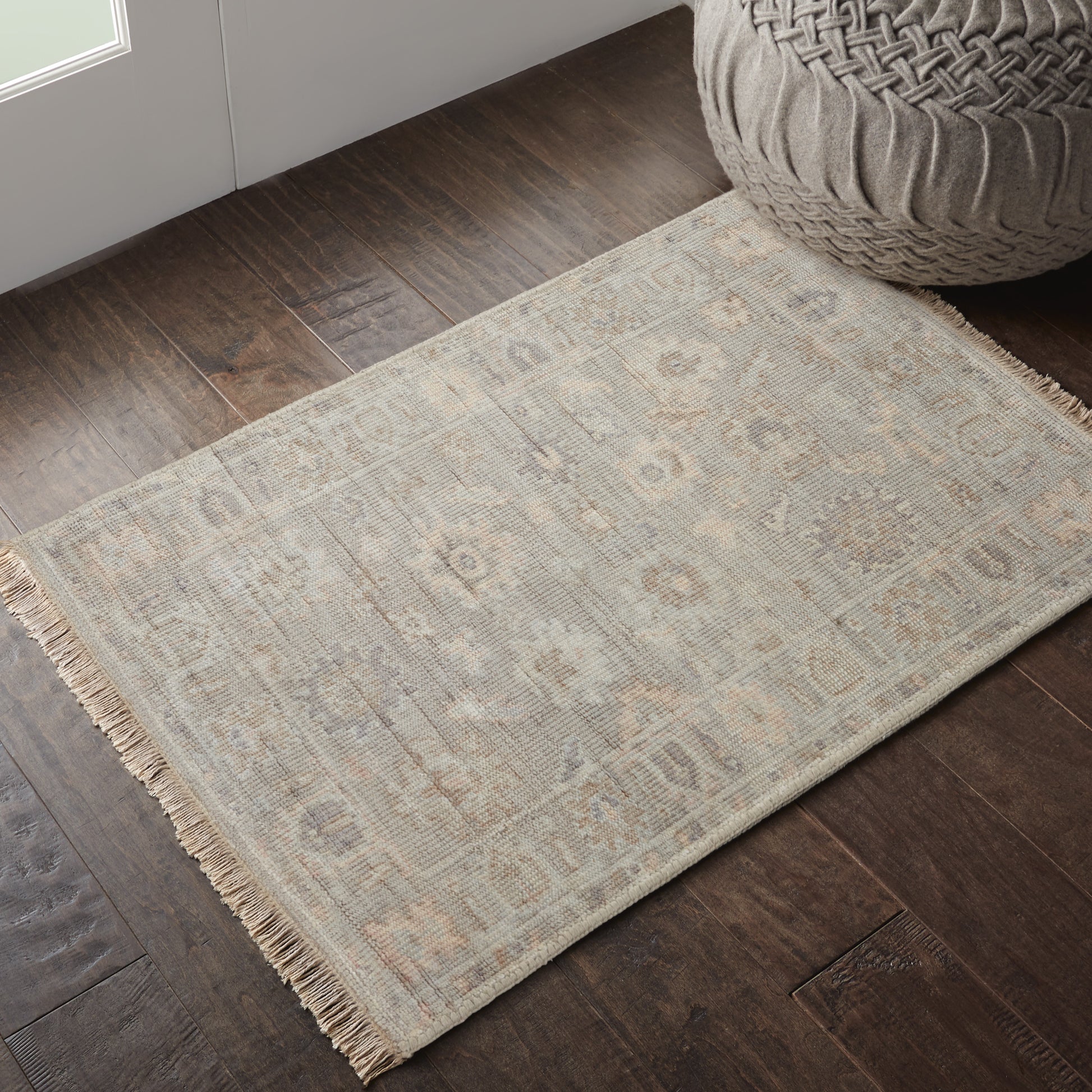Inspire conversation with the inviting color palette and traditional design of this hand-knotted rug from the Aldora Collection. Presented in silver-grey and blue, the Persian-inspired design is finished with fringe edges that add global appeal. Aldora is crafted from a blend of cotton and silk-like yarns with an exquisite sheen.