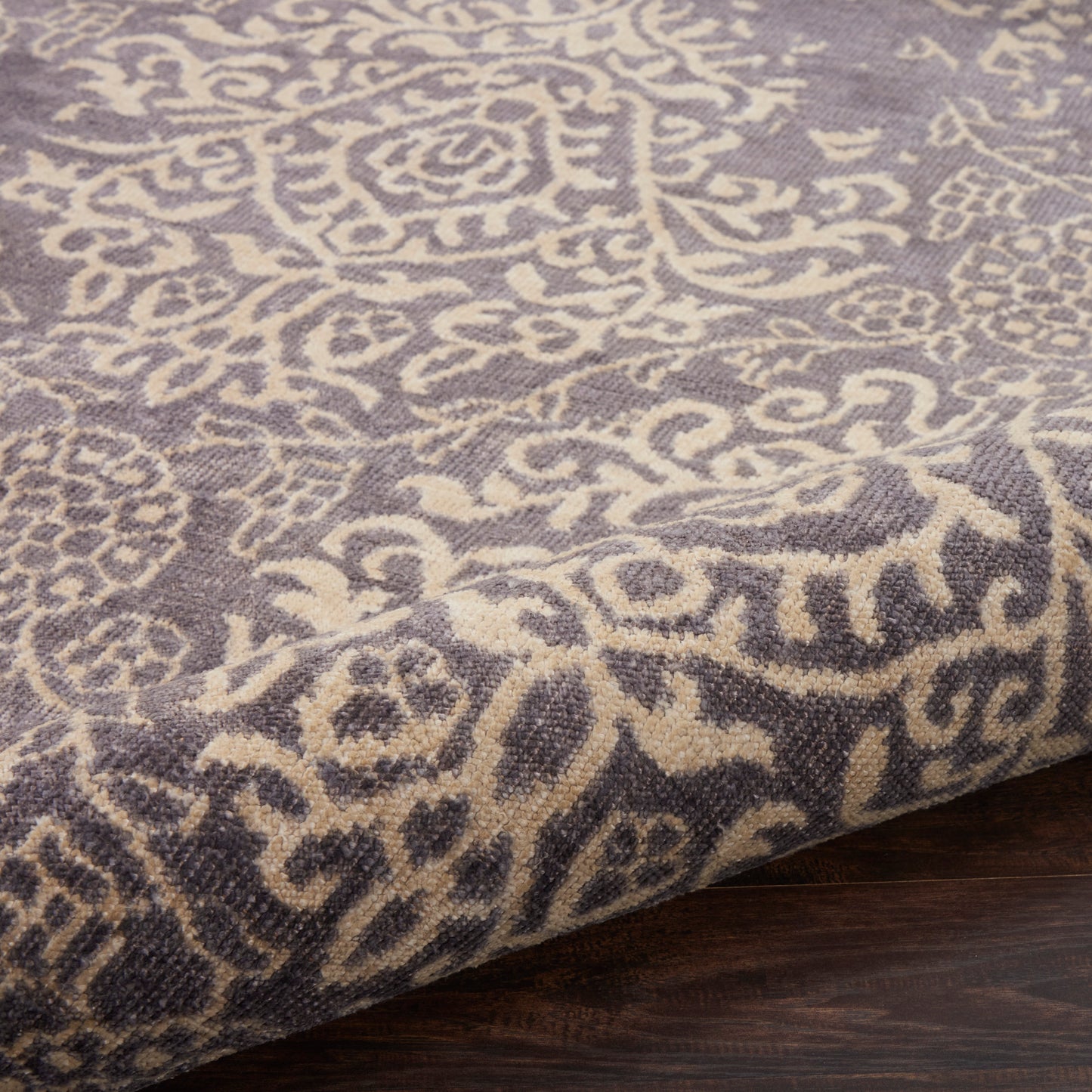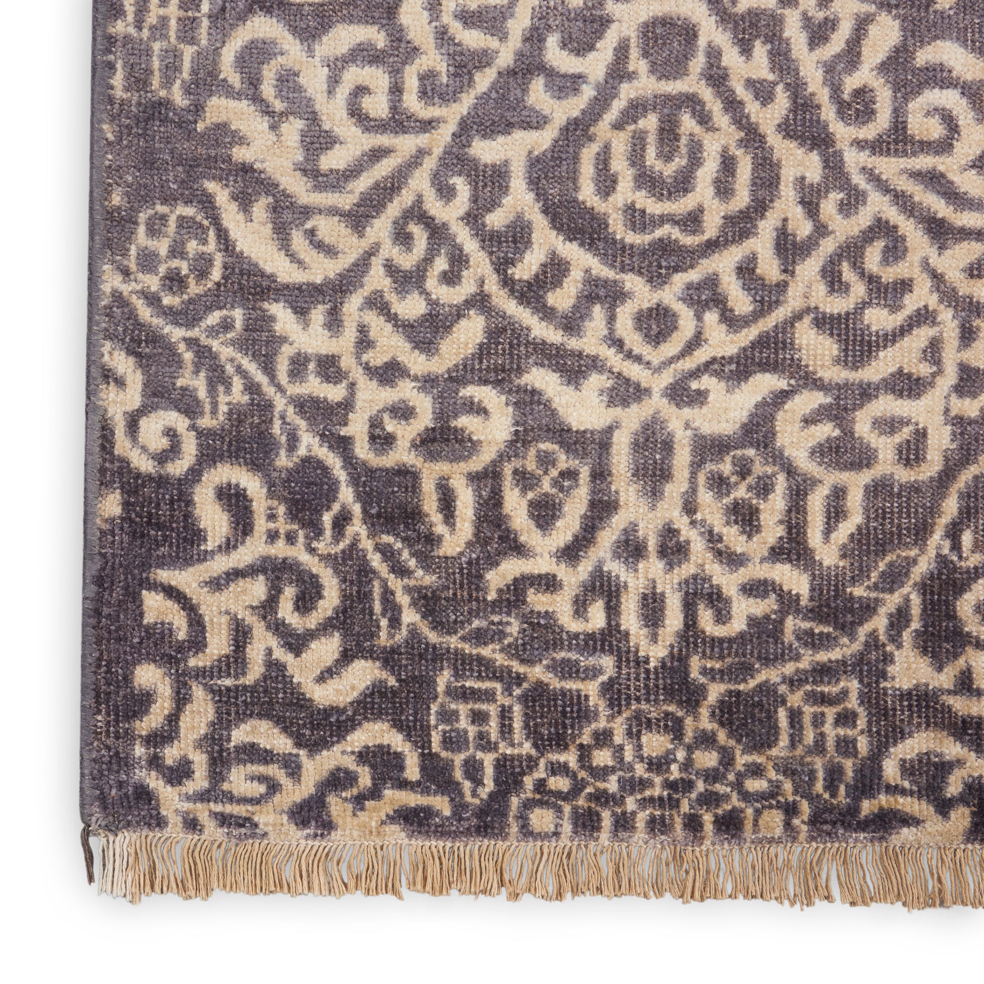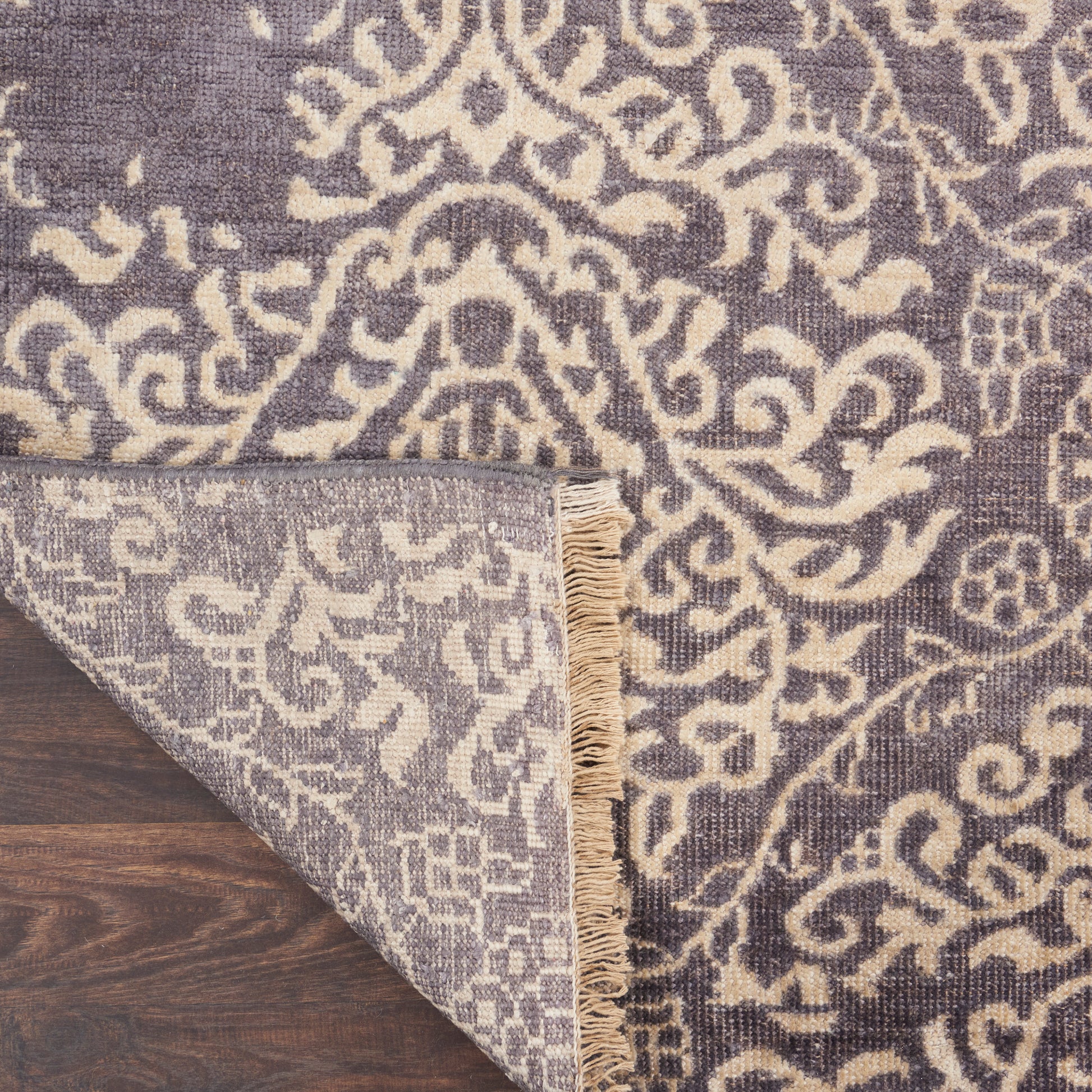 An oversized Damask design with glamorous gold fringes gets the royal treatment in regal shades of sapphire blue and ivory. Hand knotted from a splendid bamboo extruded silk-like pile, this glorious Aldora area rug from Nourison will elevate the elegance of any room.