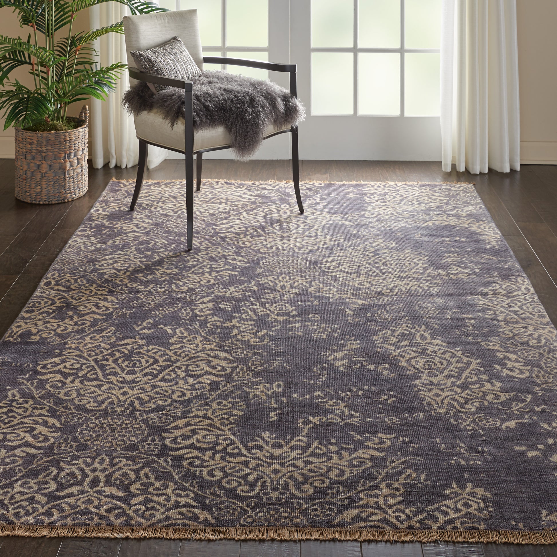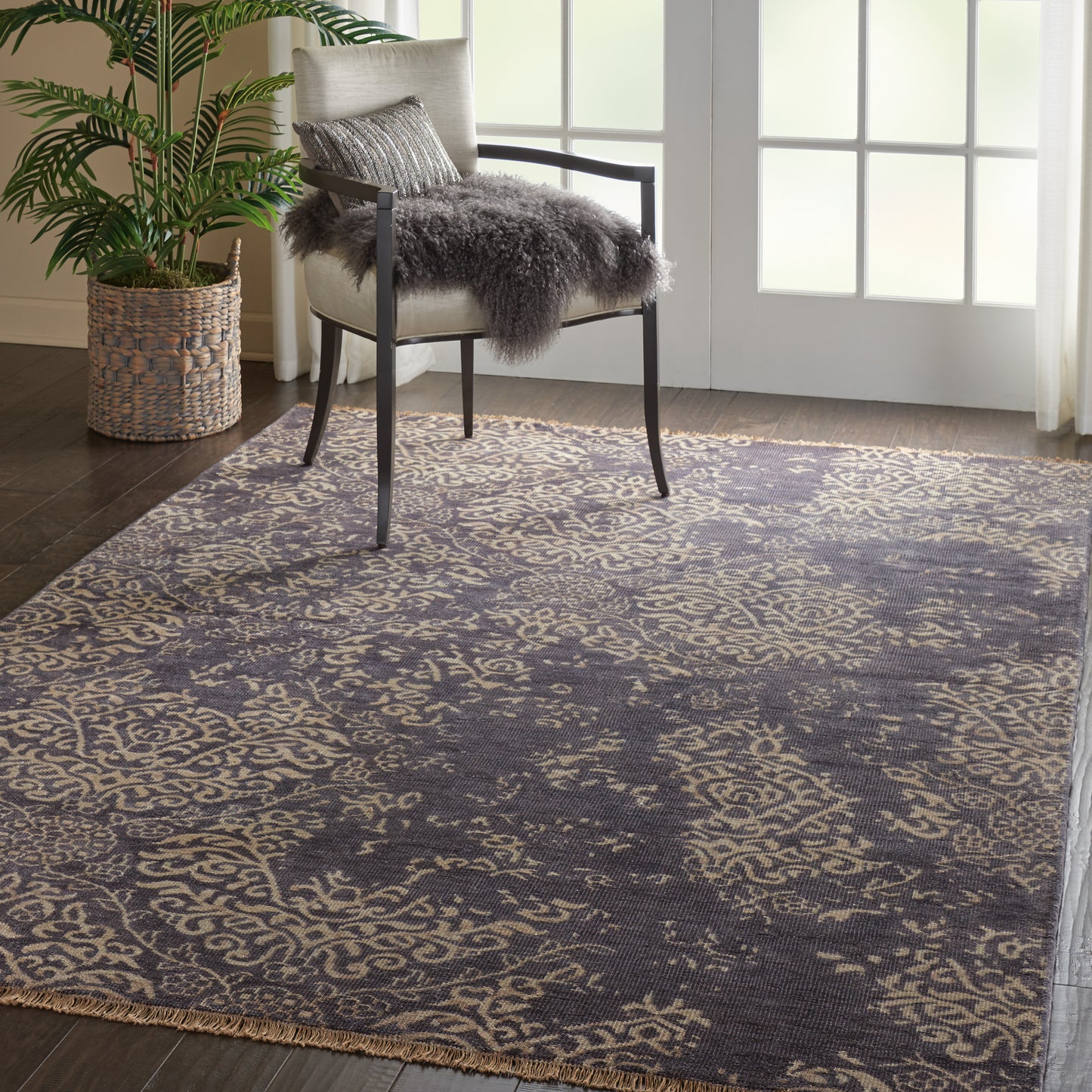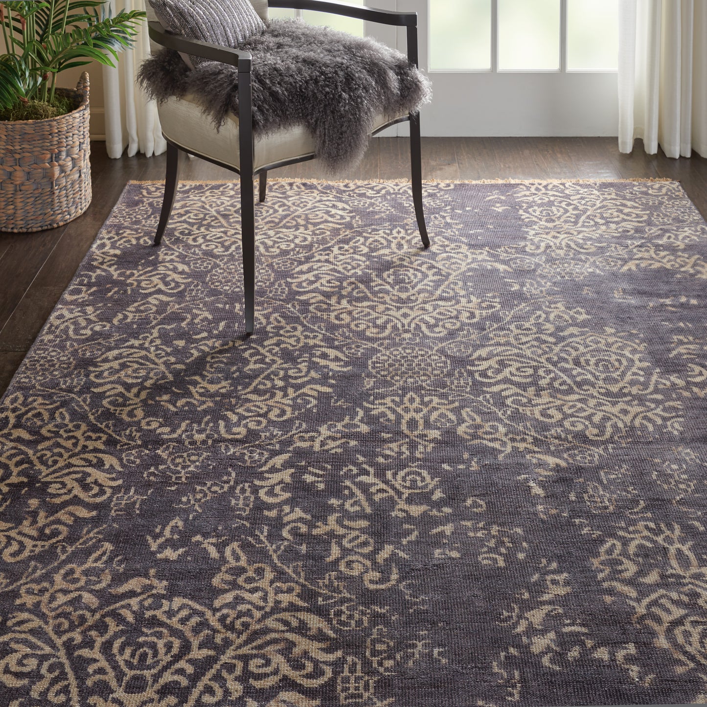An oversized Damask design with glamorous gold fringes gets the royal treatment in regal shades of sapphire blue and ivory. Hand knotted from a splendid bamboo extruded silk-like pile, this glorious Aldora area rug from Nourison will elevate the elegance of any room.