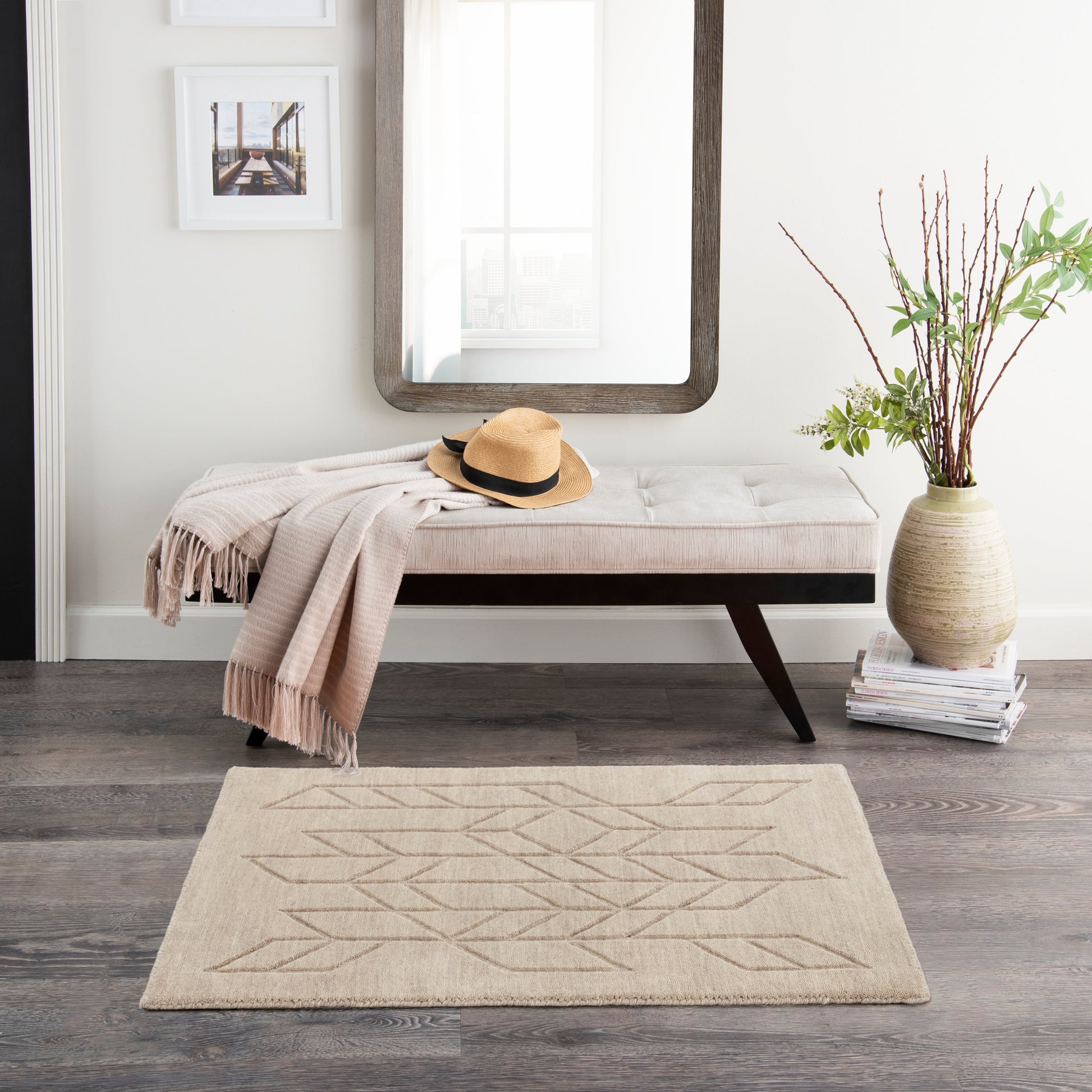 This modern beige rug from the Alessia Collection adds cozy style to your décor. Effortlessly blending style and function, this neutral rug features a heathered ground that adds nuanced color variations, a carved geometric pattern that offers a subtle layer of depth, and a medium-thick pile that has a softly cushioned texture. Handmade from 100% European wool; no backing.