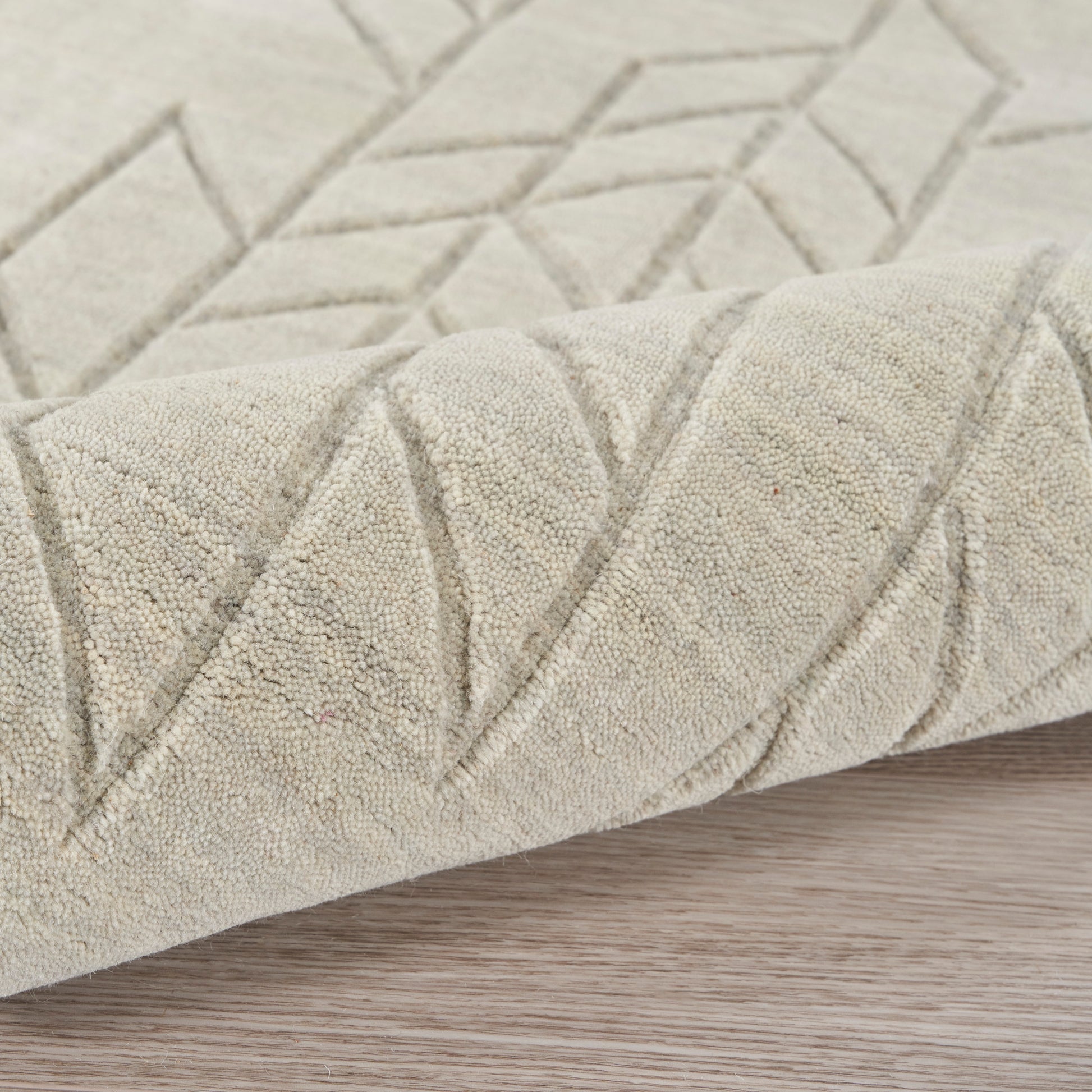 This modern sage rug from the Alessia Collection adds cozy style to your decor. Effortlessly blending style and function, this neutral rug features a heathered ground that adds nuanced color variations, a carved geometric pattern that offers a subtle layer of depth, and a medium-thick pile that has a softly cushioned texture. Handmade from 100% European wool; no backing.