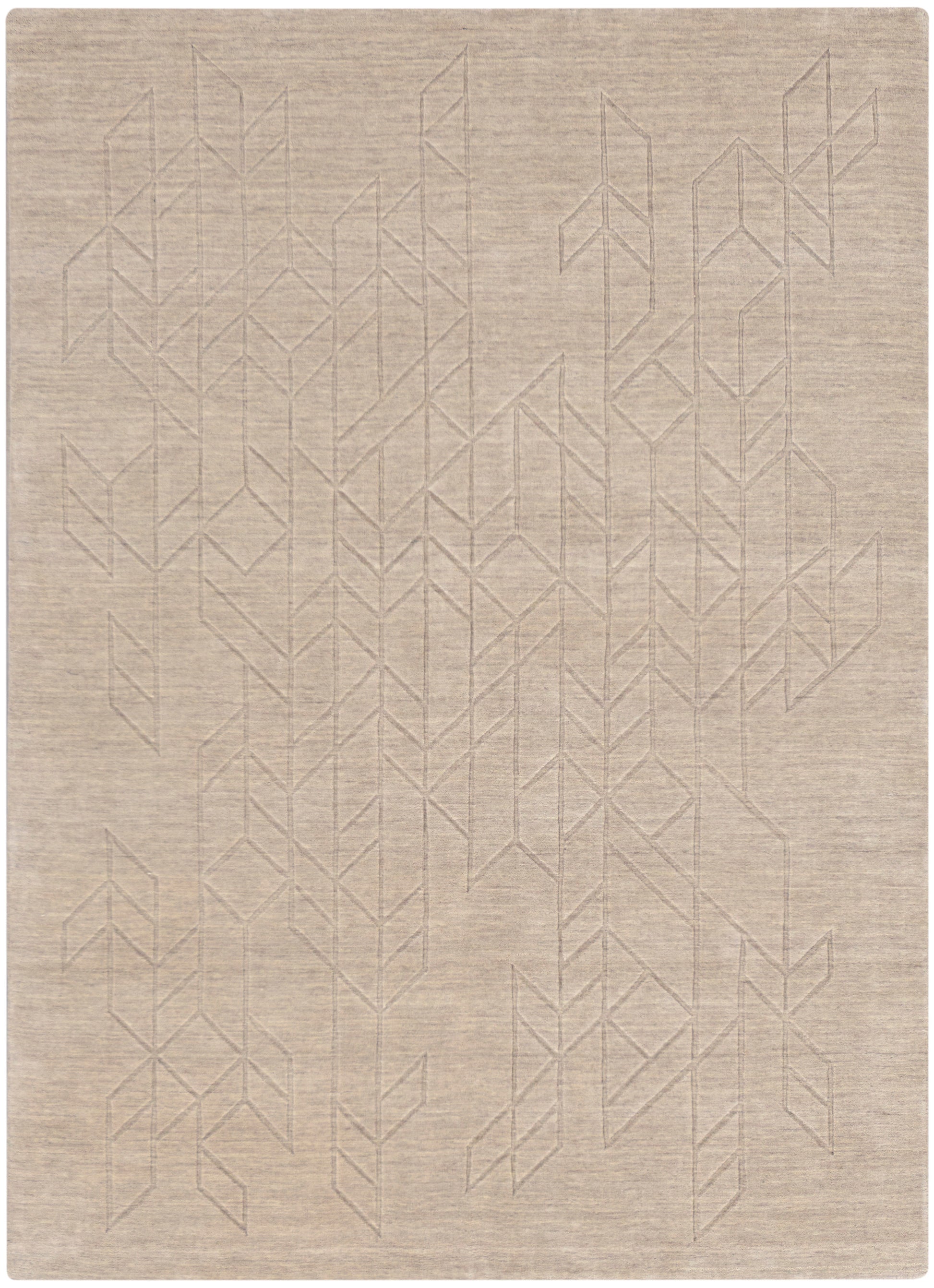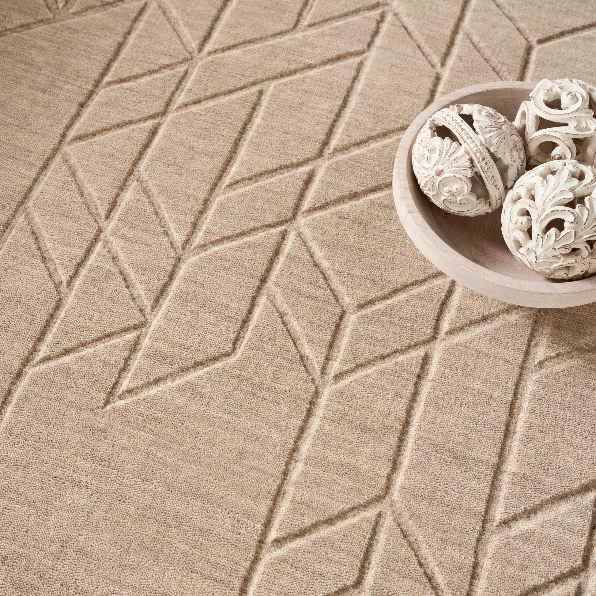 This modern beige rug from the Alessia Collection adds cozy style to your décor. Effortlessly blending style and function, this neutral rug features a heathered ground that adds nuanced color variations, a carved geometric pattern that offers a subtle layer of depth, and a medium-thick pile that has a softly cushioned texture. Handmade from 100% European wool; no backing.