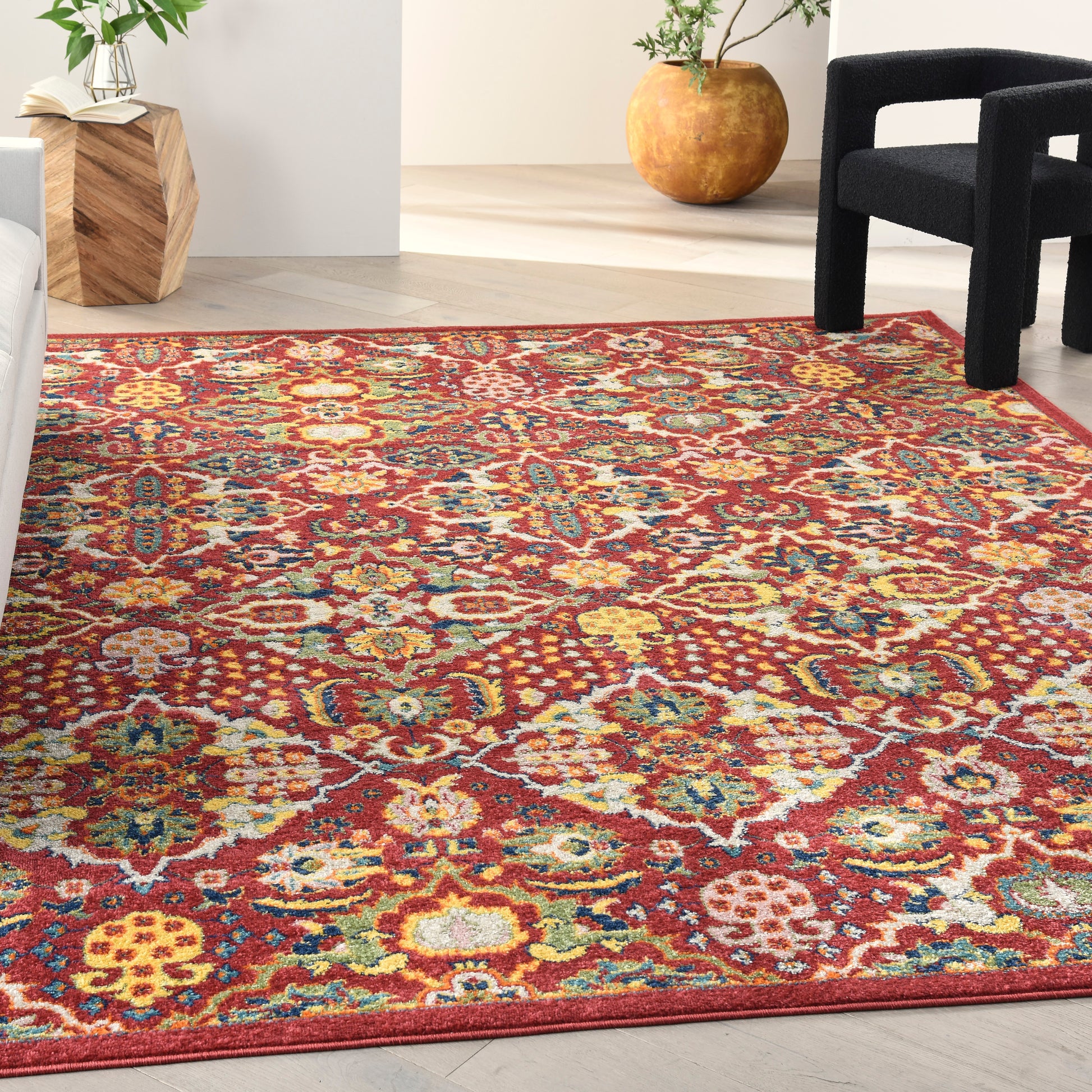 Bring a relaxed vibe to your living room or bedroom with this Allur Collection area rug. Its surface is adorned with a richly colored floral quatrefoil pattern in shades of orange, yellow, green, blue, and ivory on a red ground. This warm and colorful design adds just the right amount of pop to bohemian settings. Machine made of low shed, low profile polypropylene for easy cleaning.