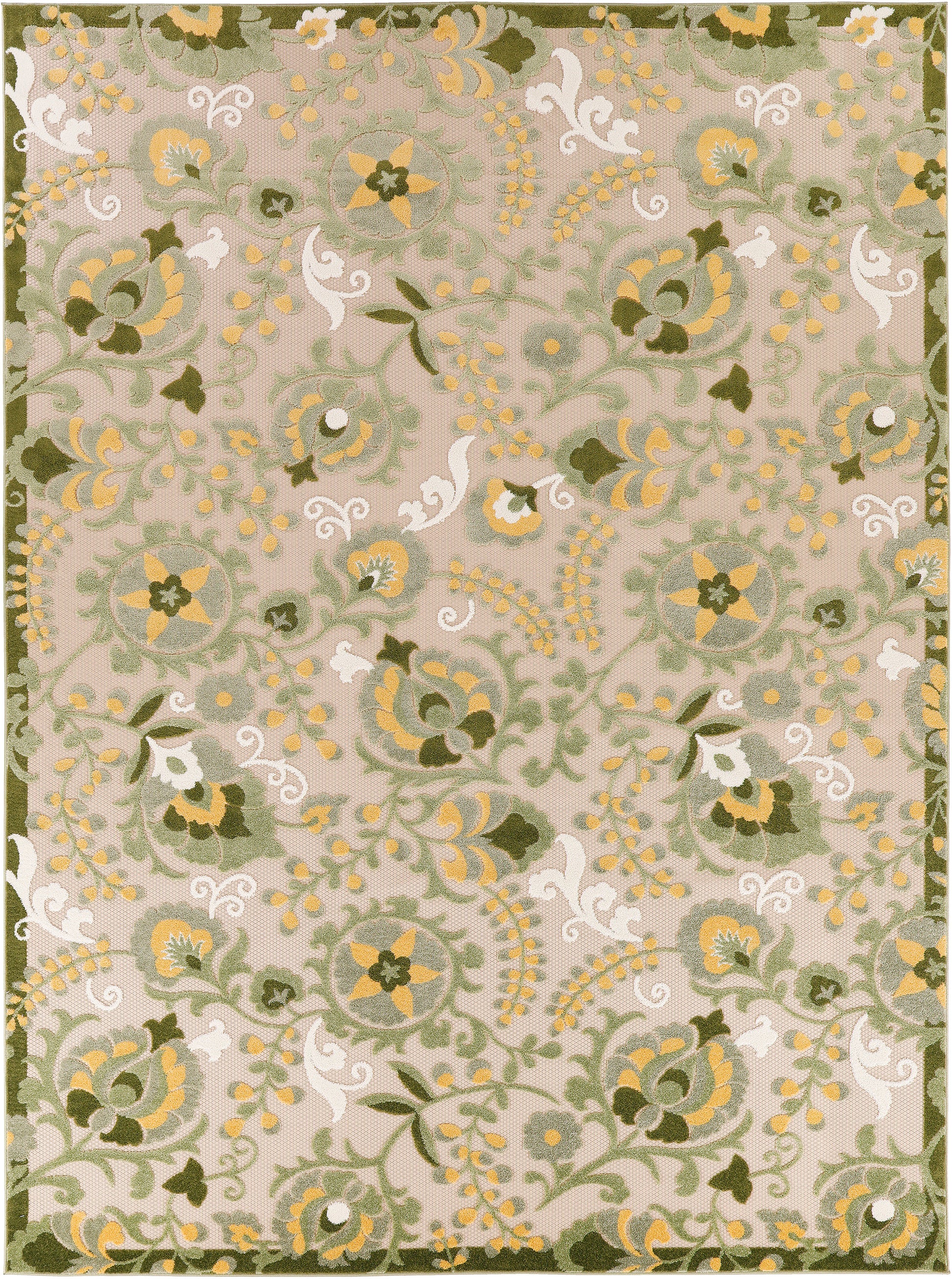 The bold, swirling vines and flowers of this Aloha outdoor rug bring a stunning pop of pattern to your patio, porch, deck, or swanked out yard. A high-low weave, presented in green, ivory, and yellow tones, combines textural patterns with an intricately woven base for exceptional look and feel. Machine-made from premium stain-resistant fibers that are easily washable with a hose: simply rinse and allow both sides time to fully air dry. To extend the life of your rug, bring indoors during extreme weather.