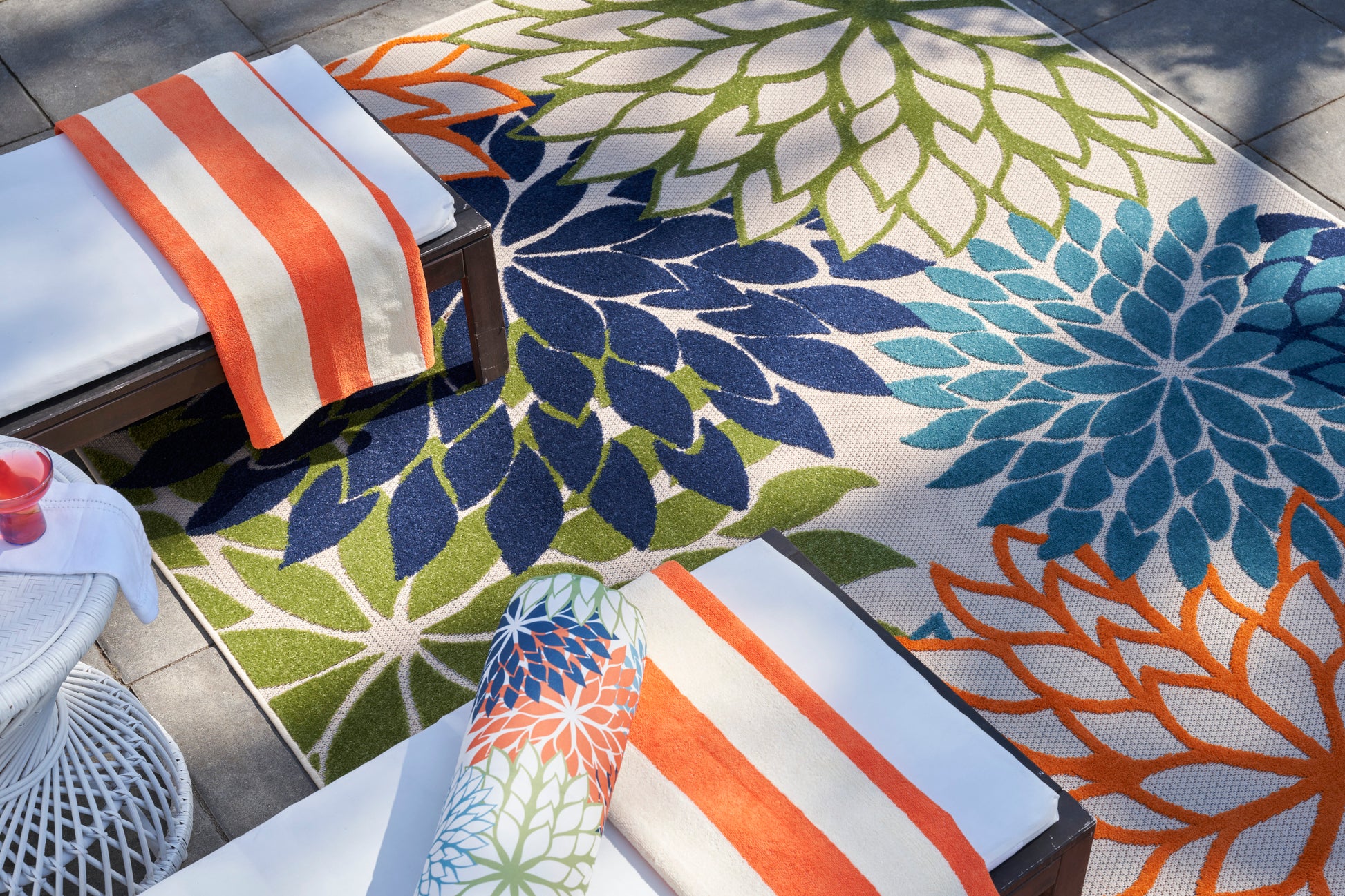 Bring extra life and excitement to your patio, deck, or porch with this Aloha floral outdoor rug. The high-low construction, presented in blue, green, and orange add a festive touch of the tropics to your patio, deck, or porch. This rug is machine-made from premium stain-resistant fibers that are easily washable with a hose: simply rinse and allow both sides time to fully air dry. To extend the life of your rug, bring indoors during extreme weather.