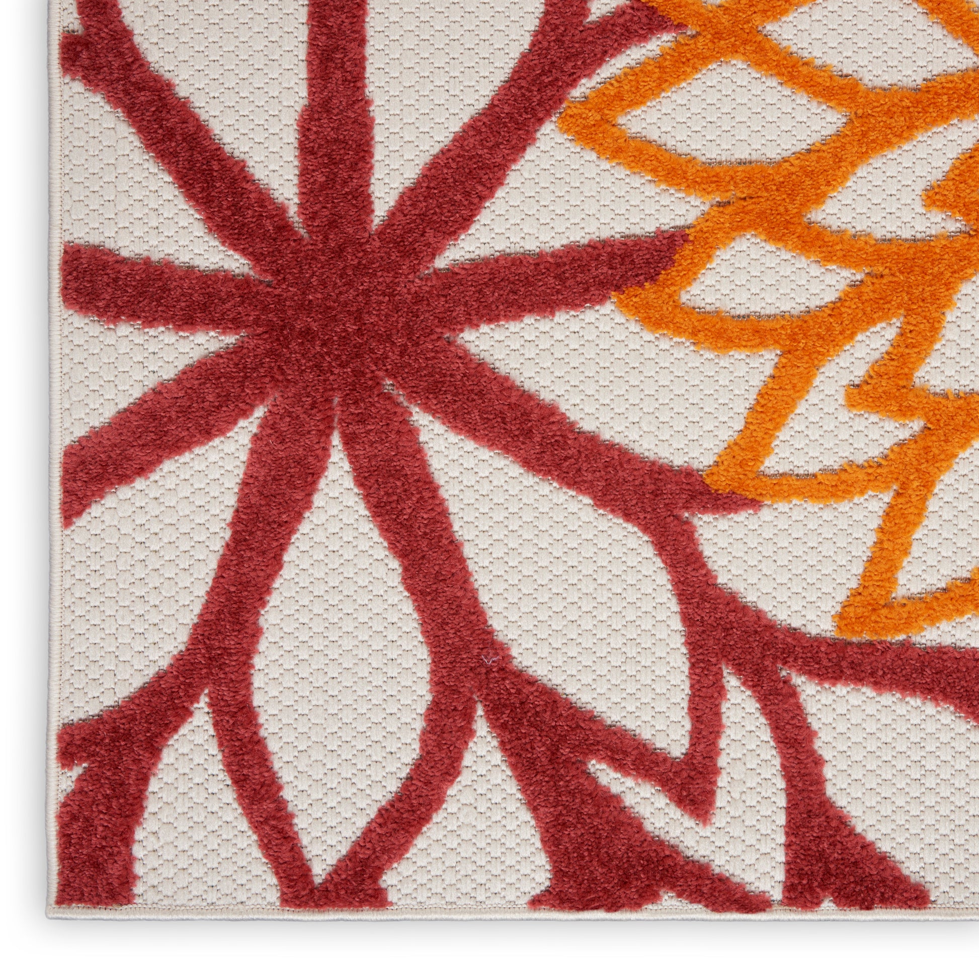 Bring extra life and excitement to your patio, deck, or porch with this Aloha floral outdoor rug. The high-low construction, presented in red, yellow, green, and orange add a festive touch of the tropics to your patio, deck, or porch. This rug is machine-made from premium stain-resistant fibers that are easily washable with a hose: simply rinse and allow both sides time to fully air dry. To extend the life of your rug, bring indoors during extreme weather.