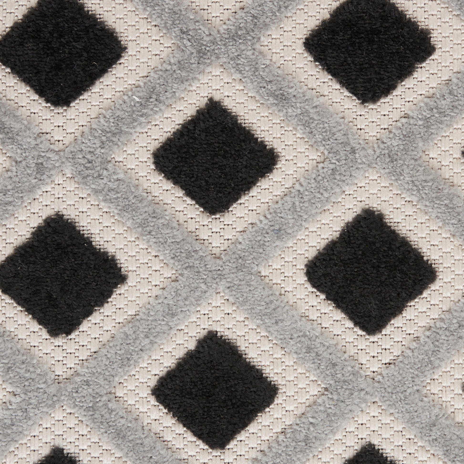 Introduce texture and pattern to your porch or deck with ease with this outdoor rug from the Aloha Collection. Simple in its sophistication, it features an all-over concentric diamond motif with a simple border in black, white, and grey tones that work beautifully in modern and contemporary settings. Made from premium stain resistant fibers for durability and ease of cleaning. Hand washable outdoors: rinse with a hose and air dry.