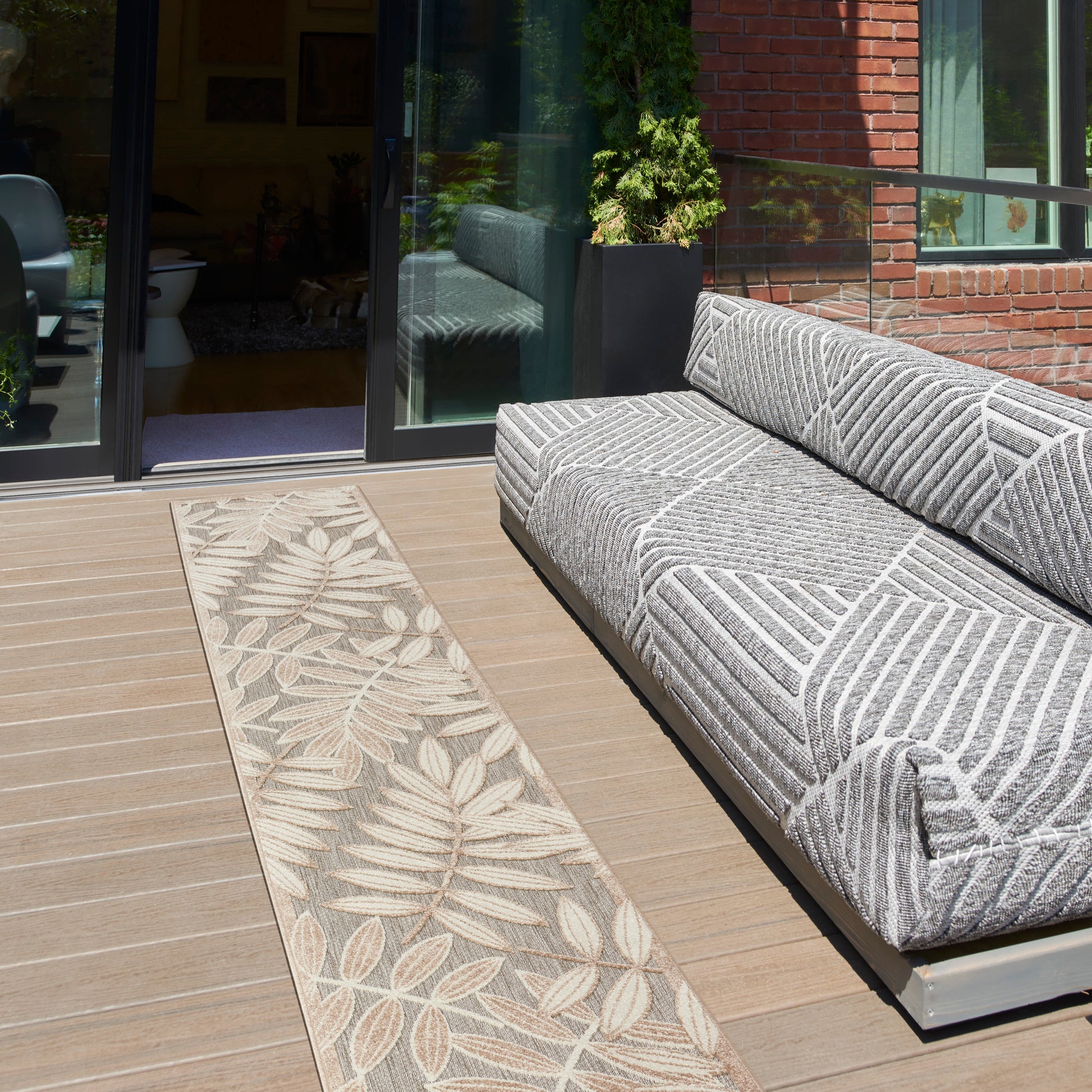The cheerful and charming oversized leaf design of this Aloha outdoor rug is a fun way to bring tropical style to your patio, balcony, porch, deck, or yard. The high-low weave, presented in shades of grey, beige, and ivory, adds soft texture and a pop of dimension designed to spark conversation. Machine-made from premium stain-resistant fibers that are easily washable with a hose: simply rinse and allow both sides time to fully air dry. To extend the life of your rug, bring indoors during extreme weather.