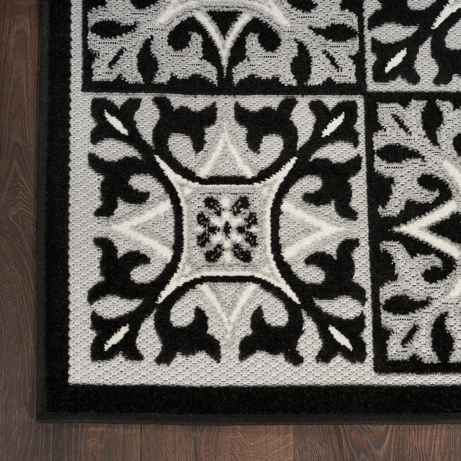 This Aloha outdoor rug brings together the best of two worlds: the classic charm of patterned tile and the warmth of an area rug! Featuring an ornate geometric pattern in black and white, this contemporary rug offers a quick and easy alternative to laying down tile. Created from premium stain-resistant fibers for long wear and low maintenance – perfect for use in both indoor and outdoor spaces such as the living room, kitchen, dining room, patio, porch, or deck. Hand washable outdoors: rinse with a hose and air dry.