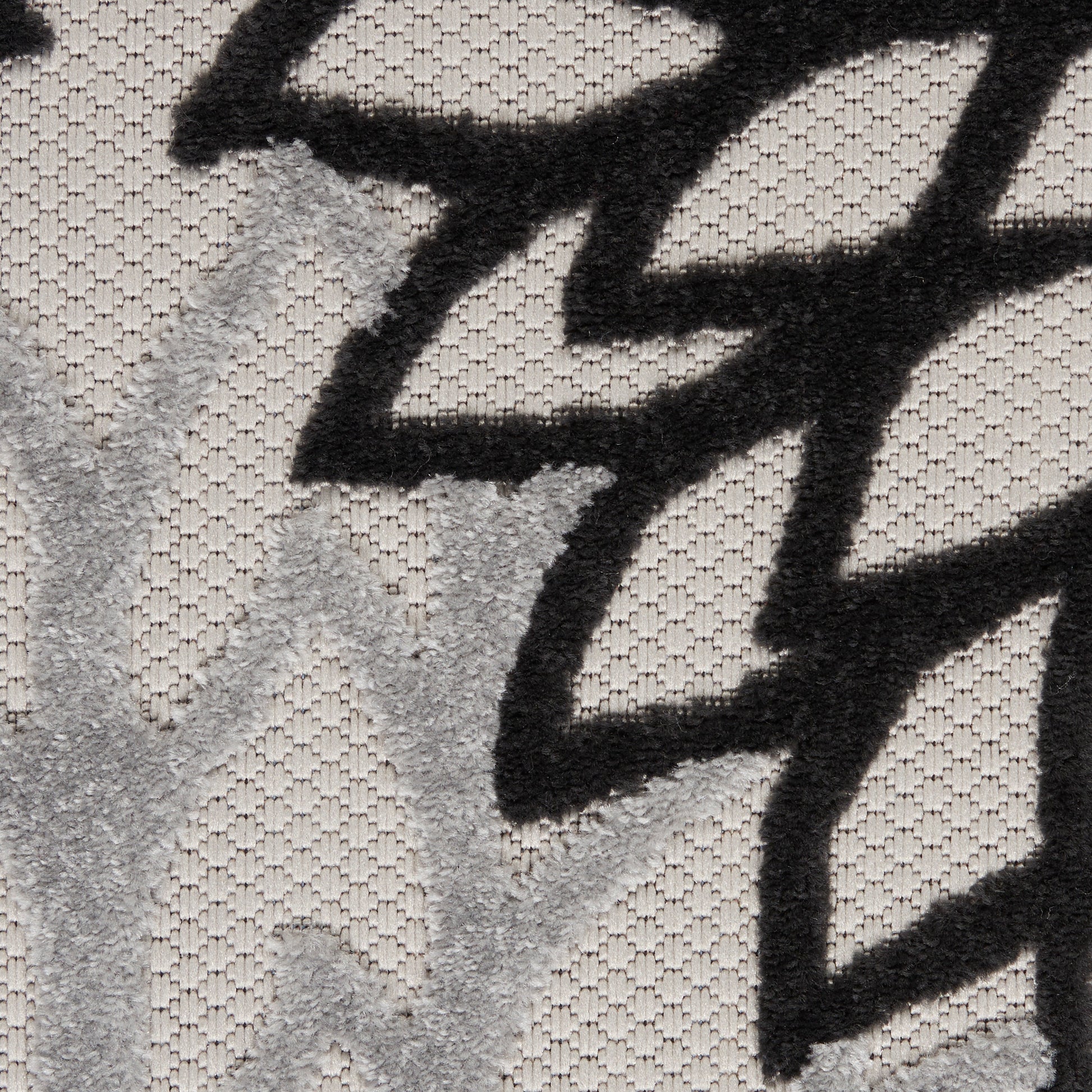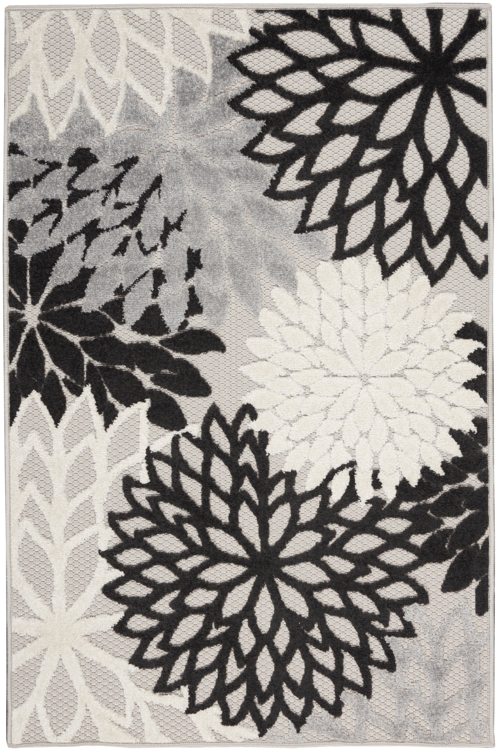 In shades of black, white and grey, this Aloha outdoor rug brings extra life and excitement to your patio, deck, or poolside. Its high-low construction combines delightful texture with an intricately woven base for an exceptional look and feel that stands up to the elements. This rug is machine-made from premium stain-resistant fibers that are easily washable with a hose: simply rinse and allow both sides time to fully air dry. To extend the life of your rug, bring indoors during extreme weather.