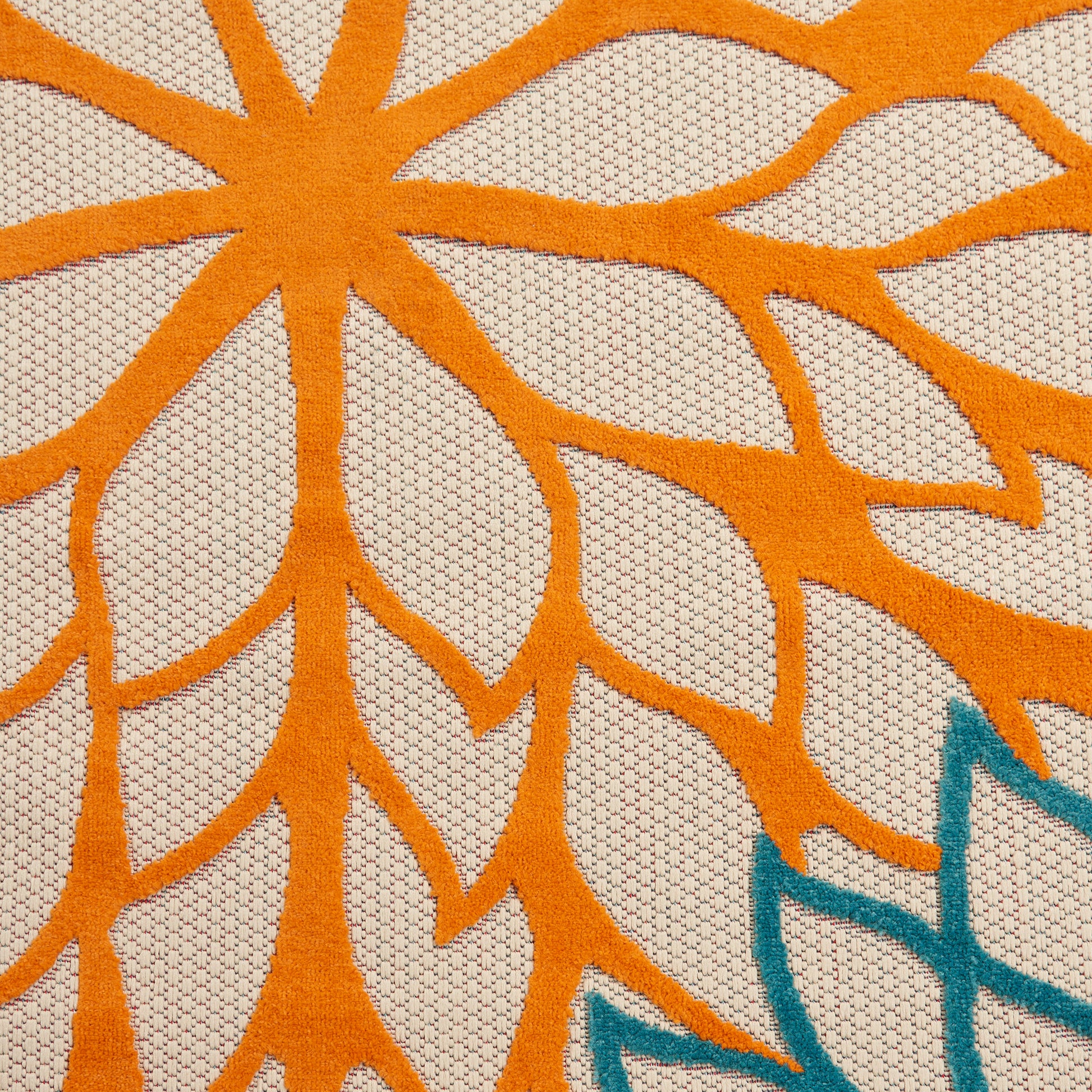 Bring extra life and excitement to your patio, deck, or porch with this Aloha floral outdoor rug. The high-low construction, presented in orange, red, and green add a festive touch of the tropics to your patio, deck, or porch. This rug is machine-made from premium stain-resistant fibers that are easily washable with a hose: simply rinse and allow both sides time to fully air dry. To extend the life of your rug, bring indoors during extreme weather.