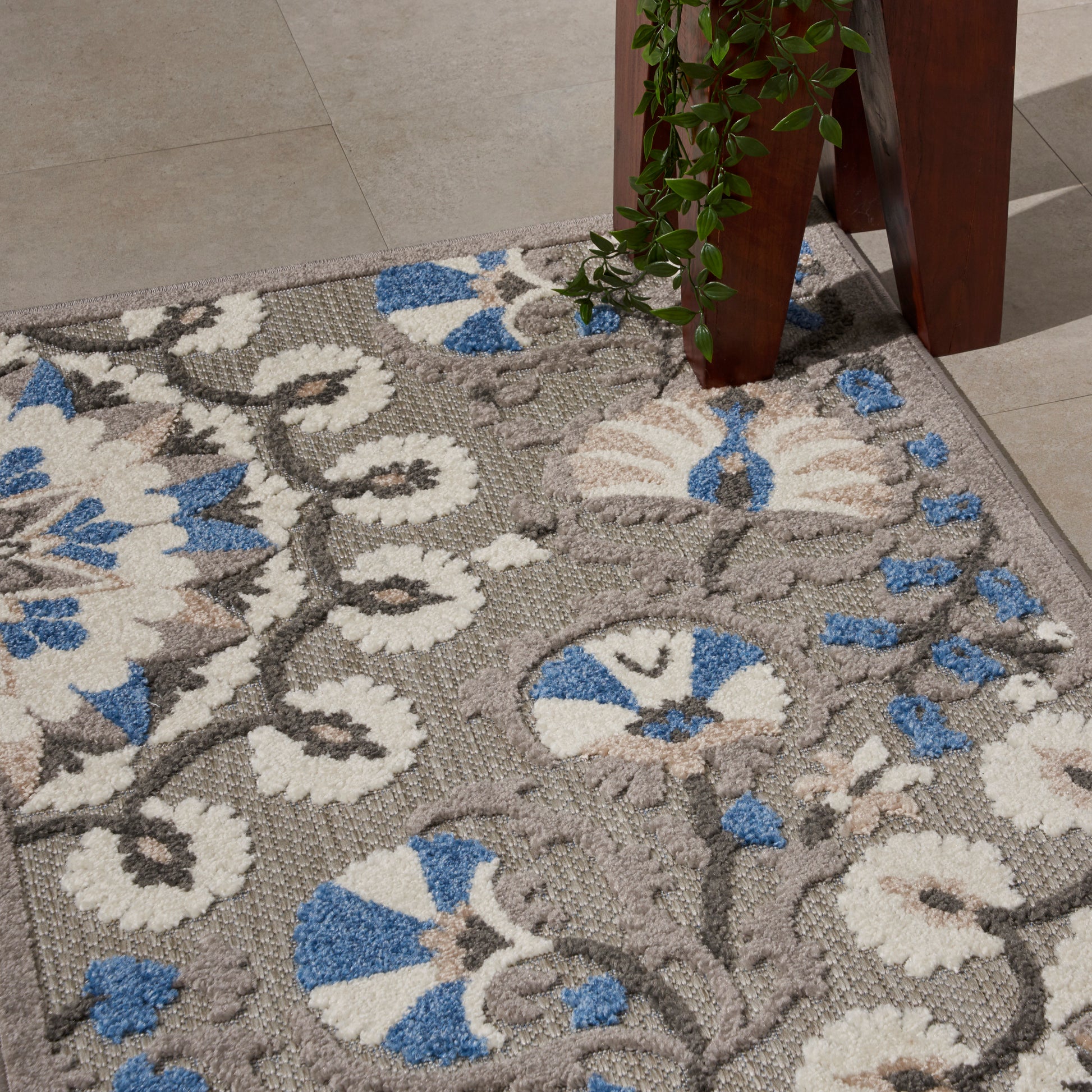 This outdoor rug from the Aloha Collection features soft cut pile and textural woven patterns in bursts of color sure to enliven any space, both inside and outside your home. Twisting vines and blooms in blue, cream and grey add a festive floral touch to your patio or deck. Machine-made from premium stain-resistant fibers that are easily washable with a hose: simply rinse and allow both sides time to fully air dry. To extend the life of your rug, bring indoors during extreme weather.