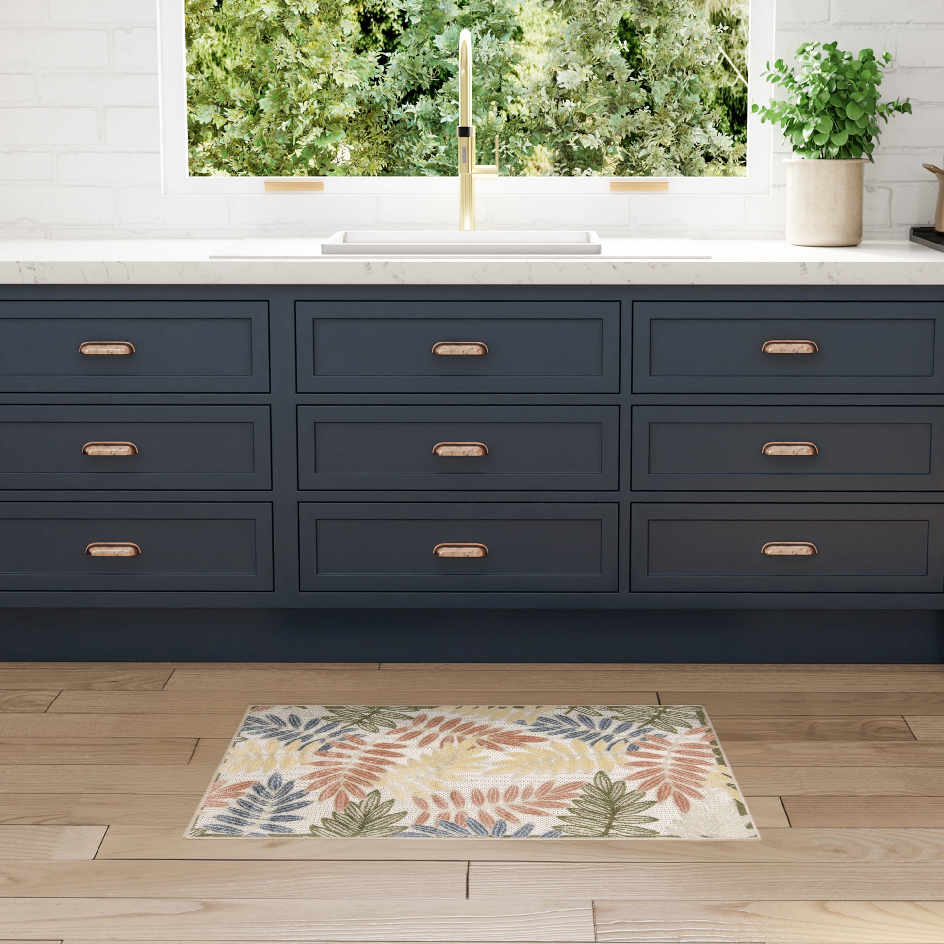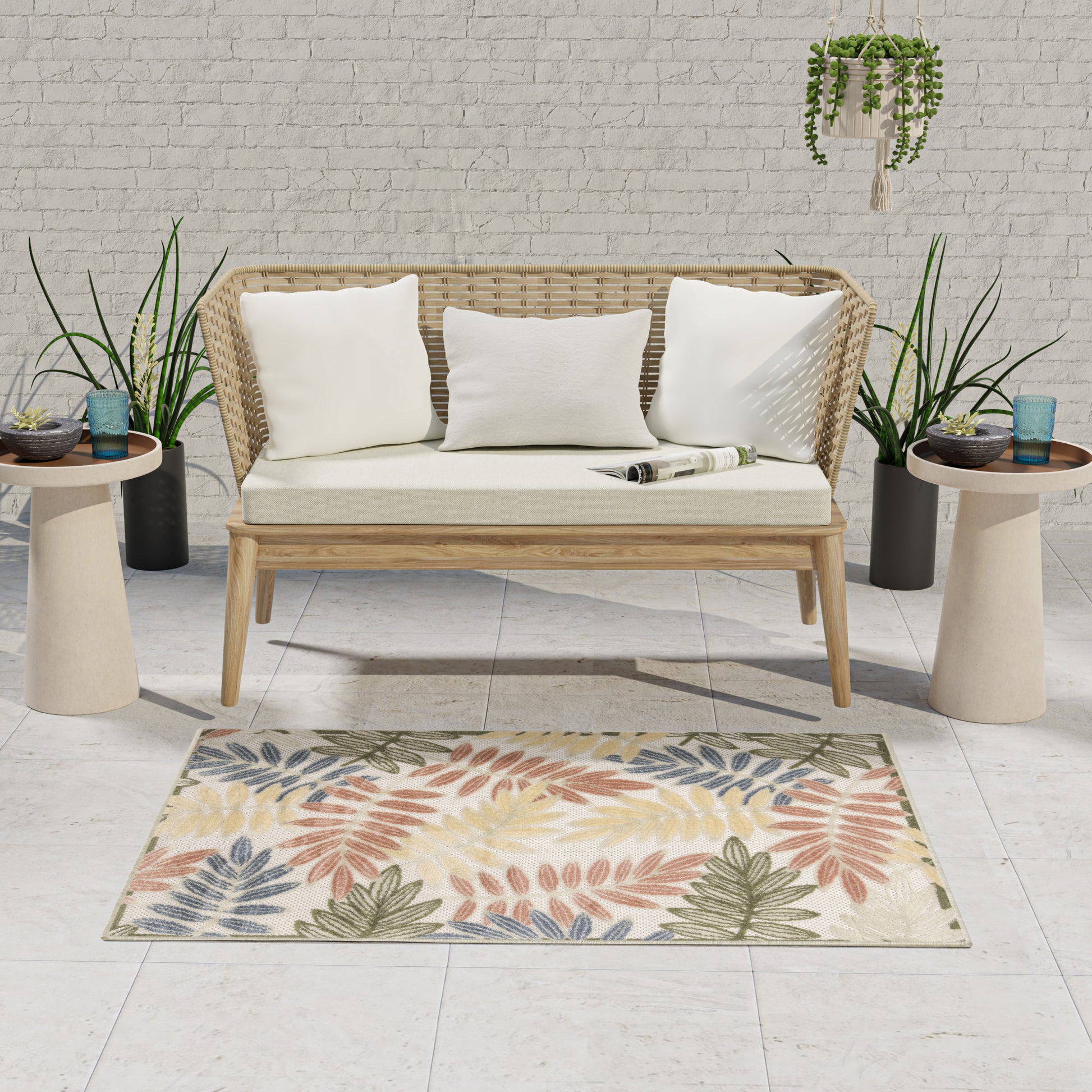 The cheerful and charming oversized leaf design of this Aloha outdoor rug is a fun way to bring tropical style to your patio, balcony, porch, deck, or yard. The high-low weave, presented in shades of ivory, rose, yellow, blue, and green, adds soft texture and a pop of dimension designed to spark conversation. Machine-made from premium stain-resistant fibers that are easily washable with a hose: simply rinse and allow both sides time to fully air dry. To extend the life of your rug, bring indoors during extreme weather.