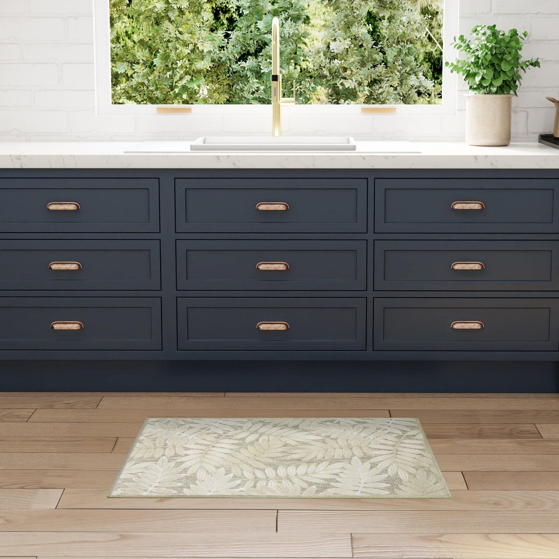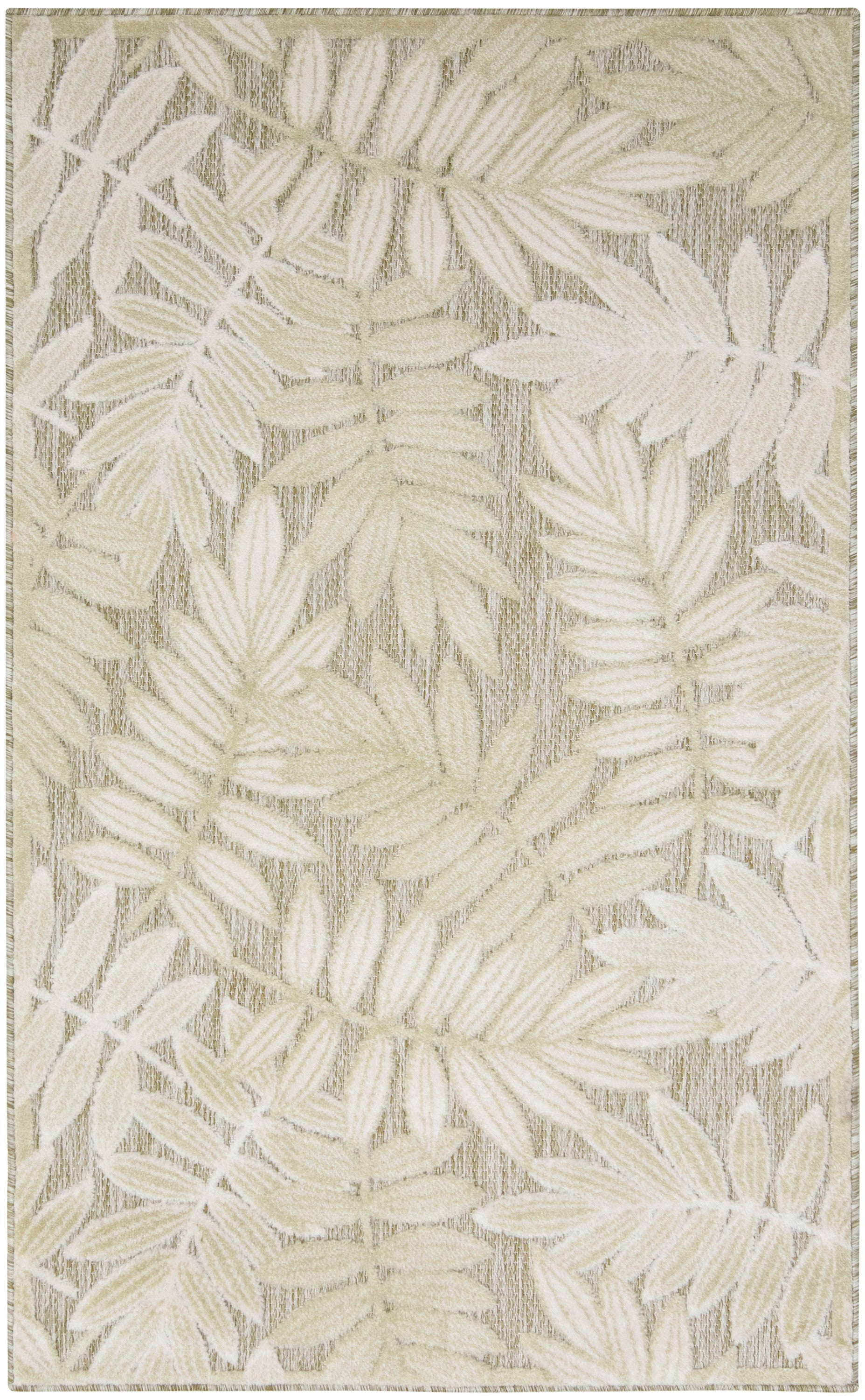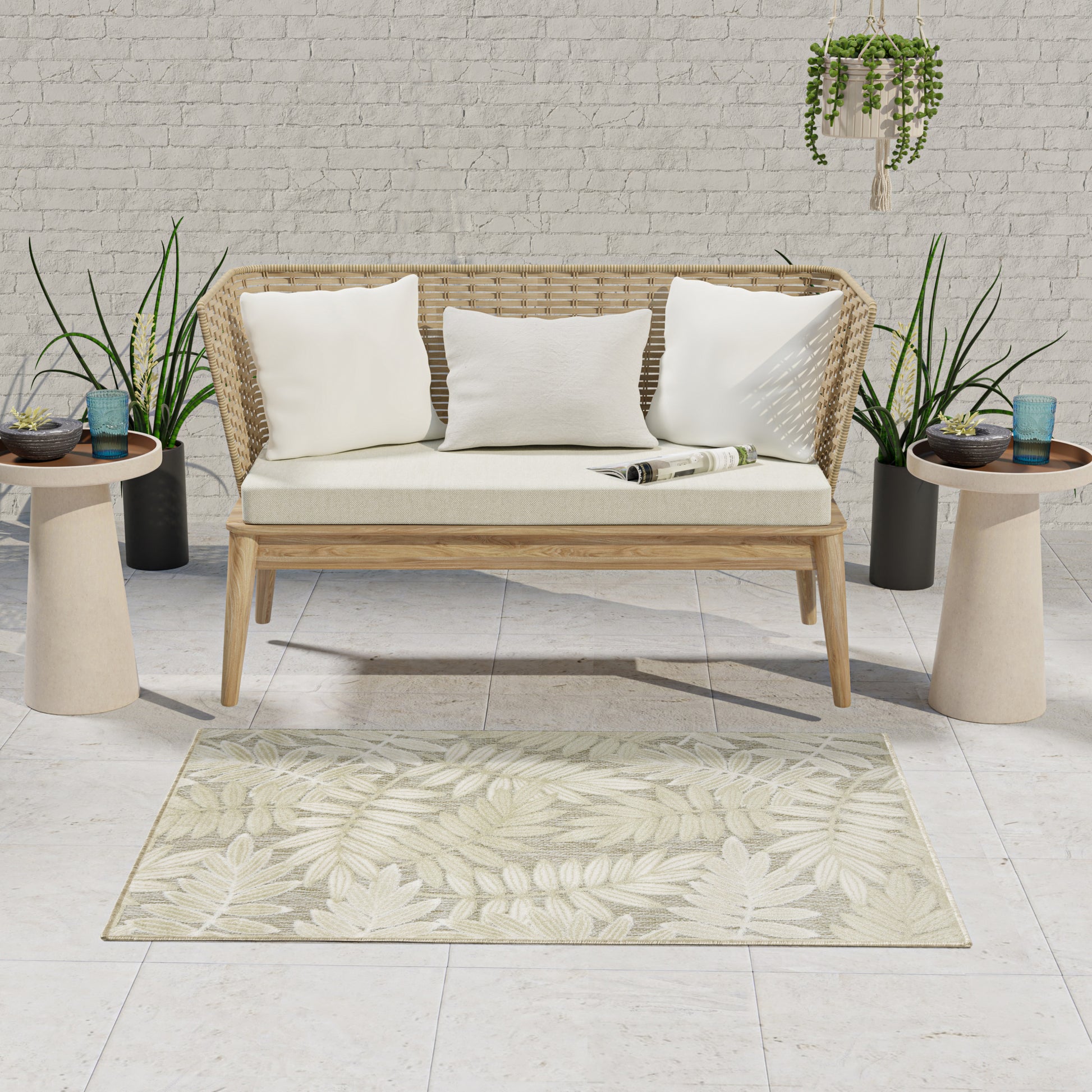The cheerful and charming oversized leaf design of this Aloha outdoor rug is a fun way to bring tropical style to your patio, balcony, porch, deck, or yard. The high-low weave, presented in shades of ivory and sage, adds soft texture and a pop of dimension designed to spark conversation. Machine-made from premium stain-resistant fibers that are easily washable with a hose: simply rinse and allow both sides time to fully air dry. To extend the life of your rug, bring indoors during extreme weather.