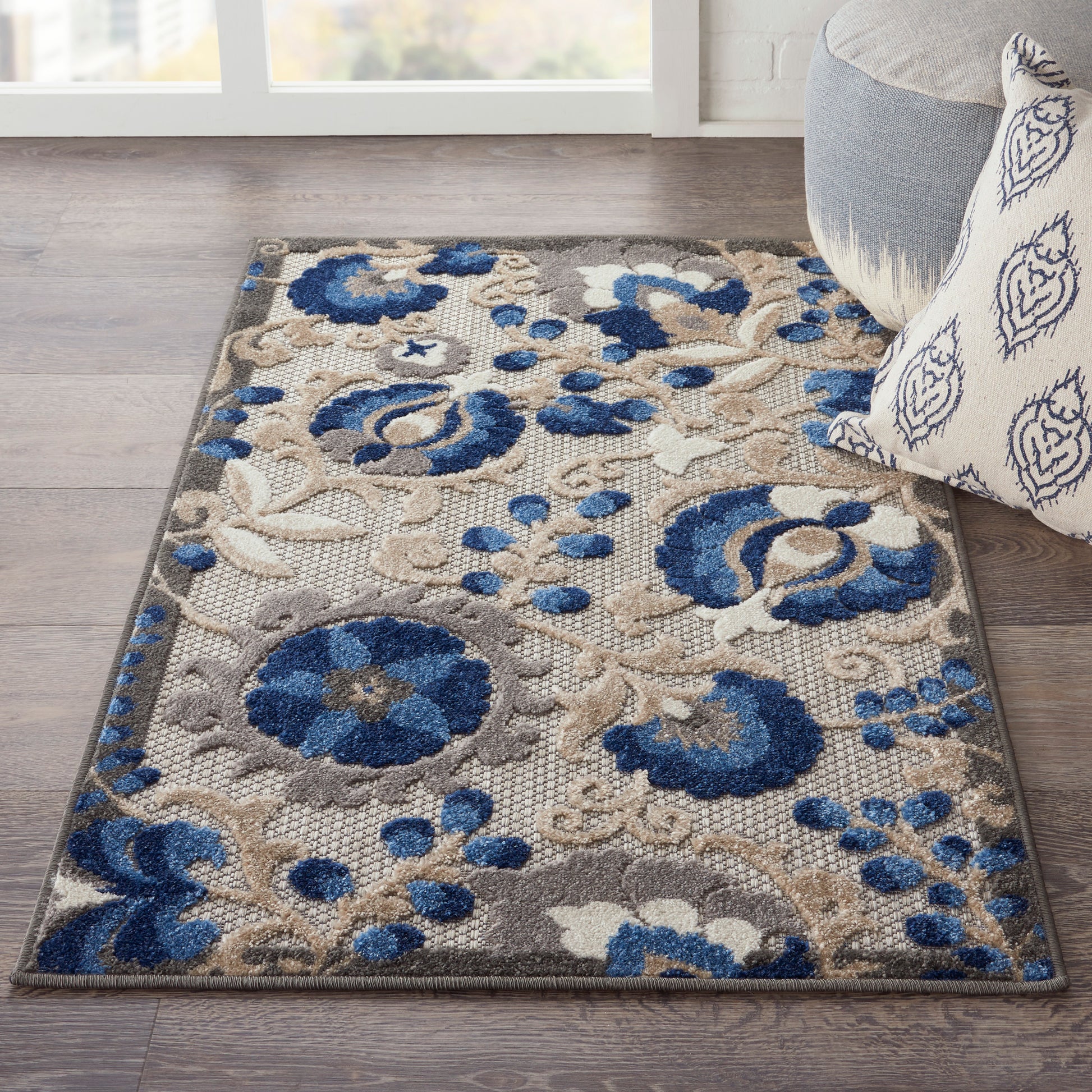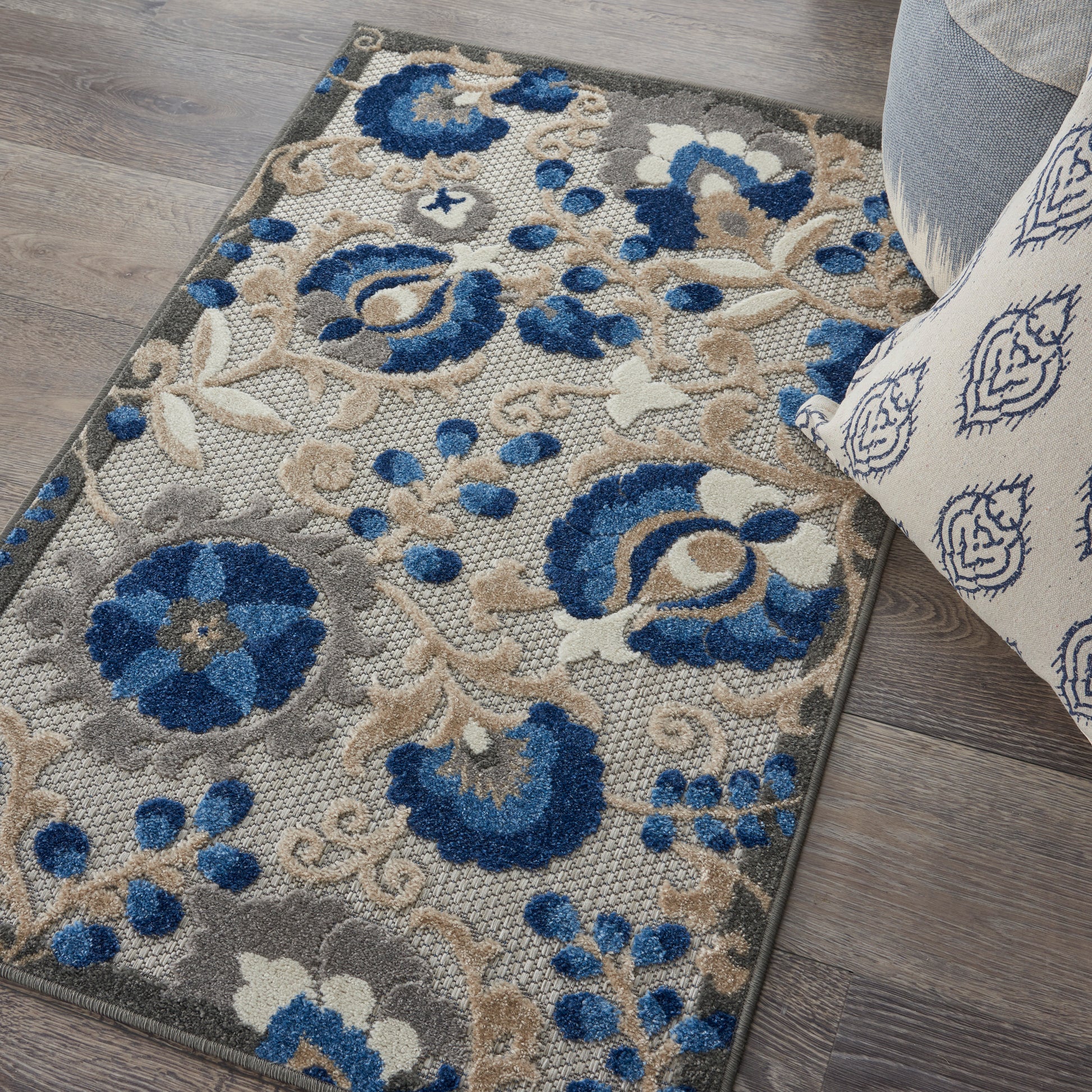 In swirling vines and flowers of blue, cream and grey, this Aloha outdoor rug complements your patio, porch or poolside setting. A high-low weave combines textural patterns with an intricately woven base for exceptional look that stands up to the elements. Machine-made from premium stain-resistant fibers that are easily washable with a hose: simply rinse and allow both sides time to fully air dry.