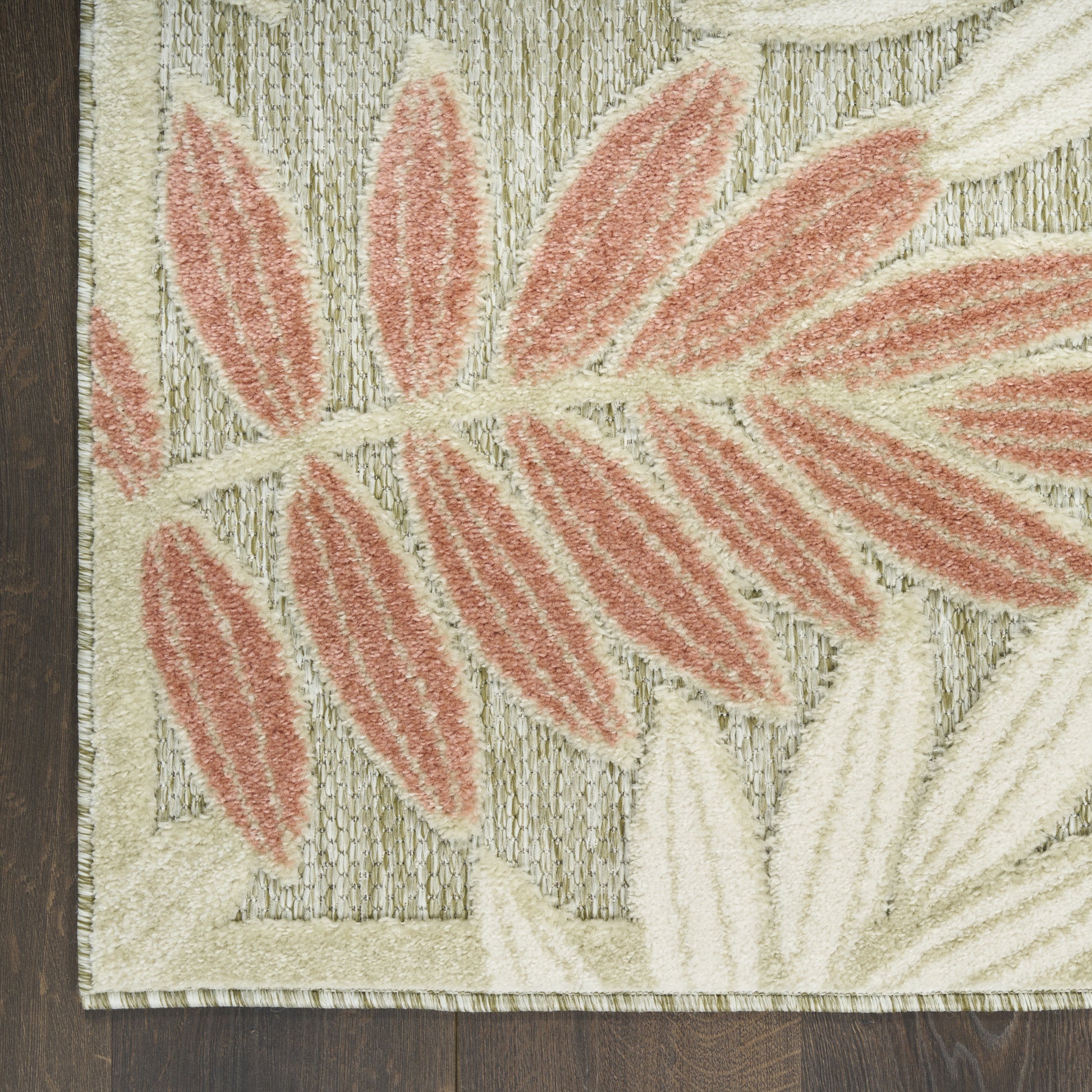 The cheerful and charming oversized leaf design of this Aloha outdoor rug is a fun way to bring tropical style to your patio, balcony, porch, deck, or yard. The high-low weave, presented in shades of ivory, rose, and sage, adds soft texture and a pop of dimension designed to spark conversation. Machine-made from premium stain-resistant fibers that are easily washable with a hose: simply rinse and allow both sides time to fully air dry. To extend the life of your rug, bring indoors during extreme weather.