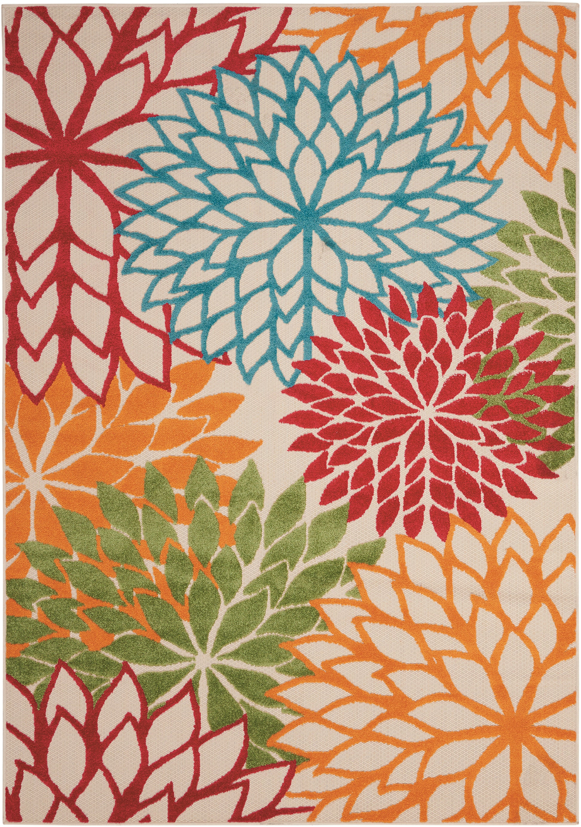 Bring extra life and excitement to your patio, deck, or porch with this Aloha floral outdoor rug. The high-low construction, presented in orange, red, and green add a festive touch of the tropics to your patio, deck, or porch. This rug is machine-made from premium stain-resistant fibers that are easily washable with a hose: simply rinse and allow both sides time to fully air dry. To extend the life of your rug, bring indoors during extreme weather.