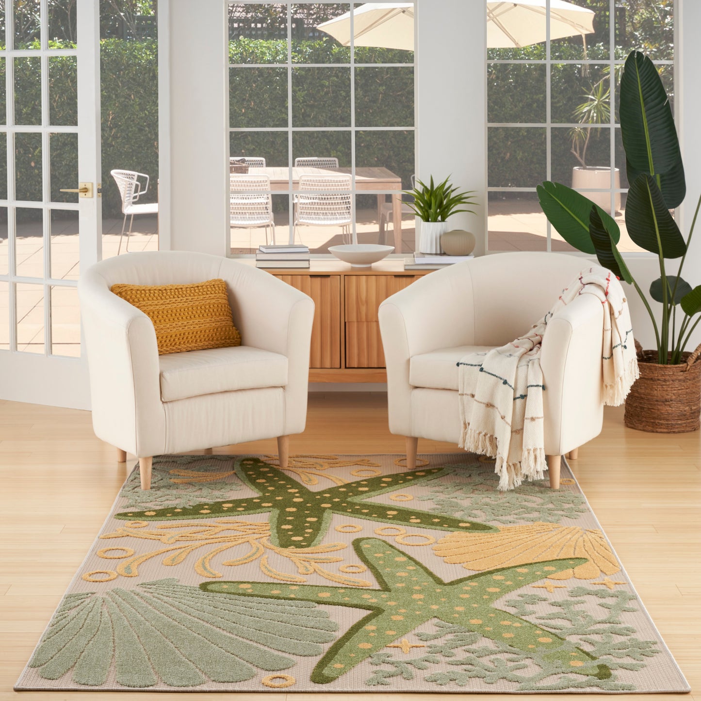 Roll out your own little slice of the beach life with this green and yellow coastal outdoor area rug from the Aloha Collection. Breezy starfish, seashells, and undersea bubbles set a foundation for festive days on your patio, deck, or anywhere inside your home. Made from premium stain resistant fibers for durability and ease of cleaning. Hand washable outdoors: rinse with a hose and air dry.