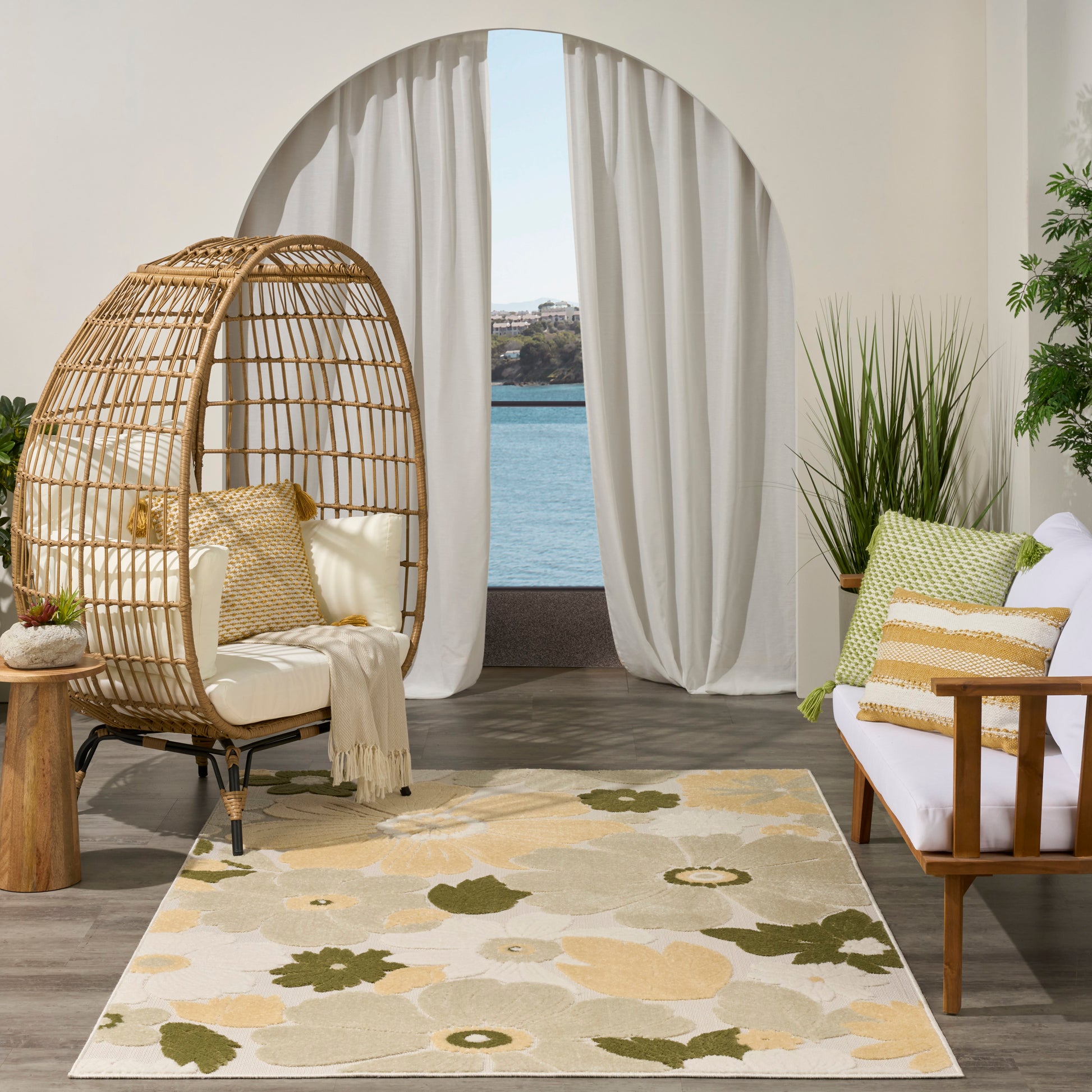 Bring a fresh and inviting burst of pattern to any space with this green, grey, white, and yellow outdoor rug from the Aloha Collection. The oversized floral pattern, enhanced by a high-low dimensional pile, creates a cheerful focal point for patio conversation areas and living rooms alike. This colorful rug is both stylish and functional in a 100% polypropylene construction that’s easy to clean, making it ideal for busy households with kids and pets.