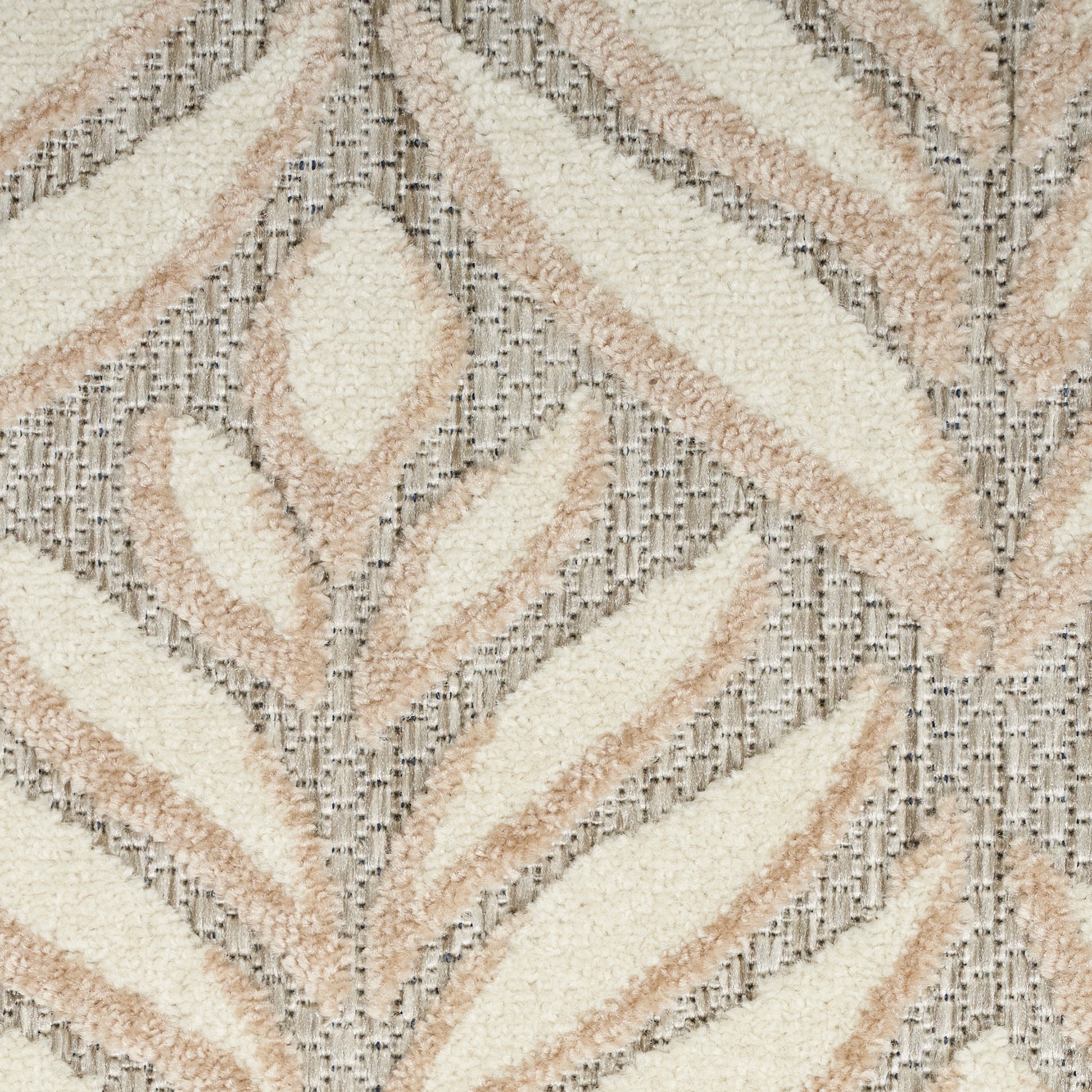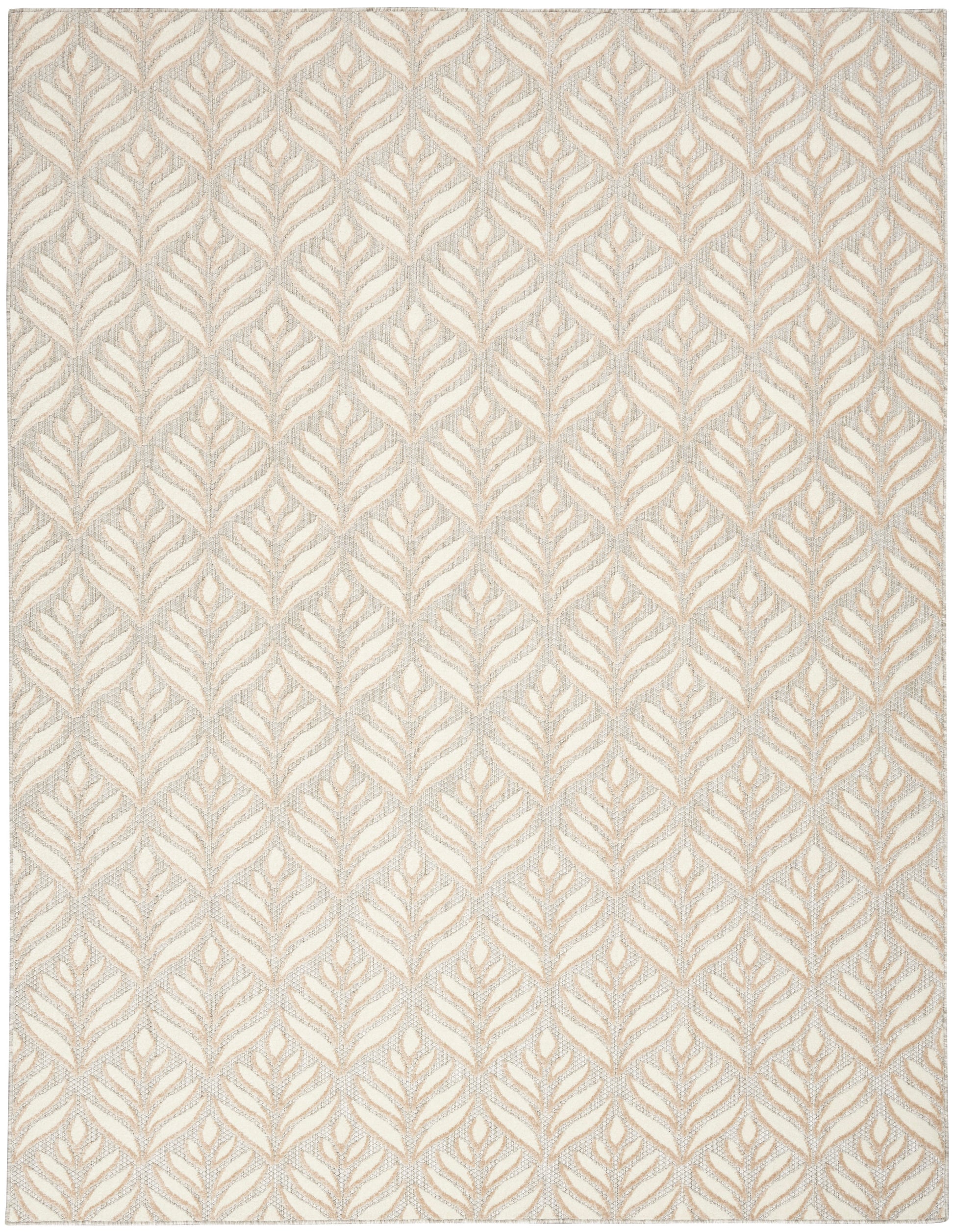 Tropical meets modern with this ivory and grey outdoor rug from the Aloha Collection. The flatwoven design is adorned with a raised, repeat palm leaf pattern that adds a subtle layer of dimension. Presented in calming colors, this botanical rug beautifully complements your patio, balcony, or deck. Made from durable polypropylene yarns that make it great for use in high-traffic indoor spaces as well, such as your kitchen, dining room, and living room. Hand washable outdoors: rinse with a hose and air dry.