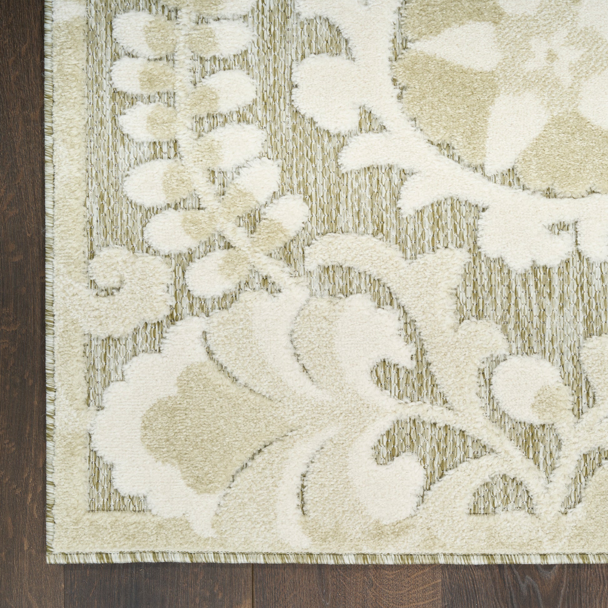 In swirling vines and flowers of sage and ivory multicolor, this Aloha outdoor rug complements your patio, porch or poolside setting. A high-low weave combines textural patterns with an intricately woven base for exceptional look that stands up to the elements. Machine-made from premium stain-resistant fibers that are easily washable with a hose: simply rinse and allow both sides time to fully air dry.