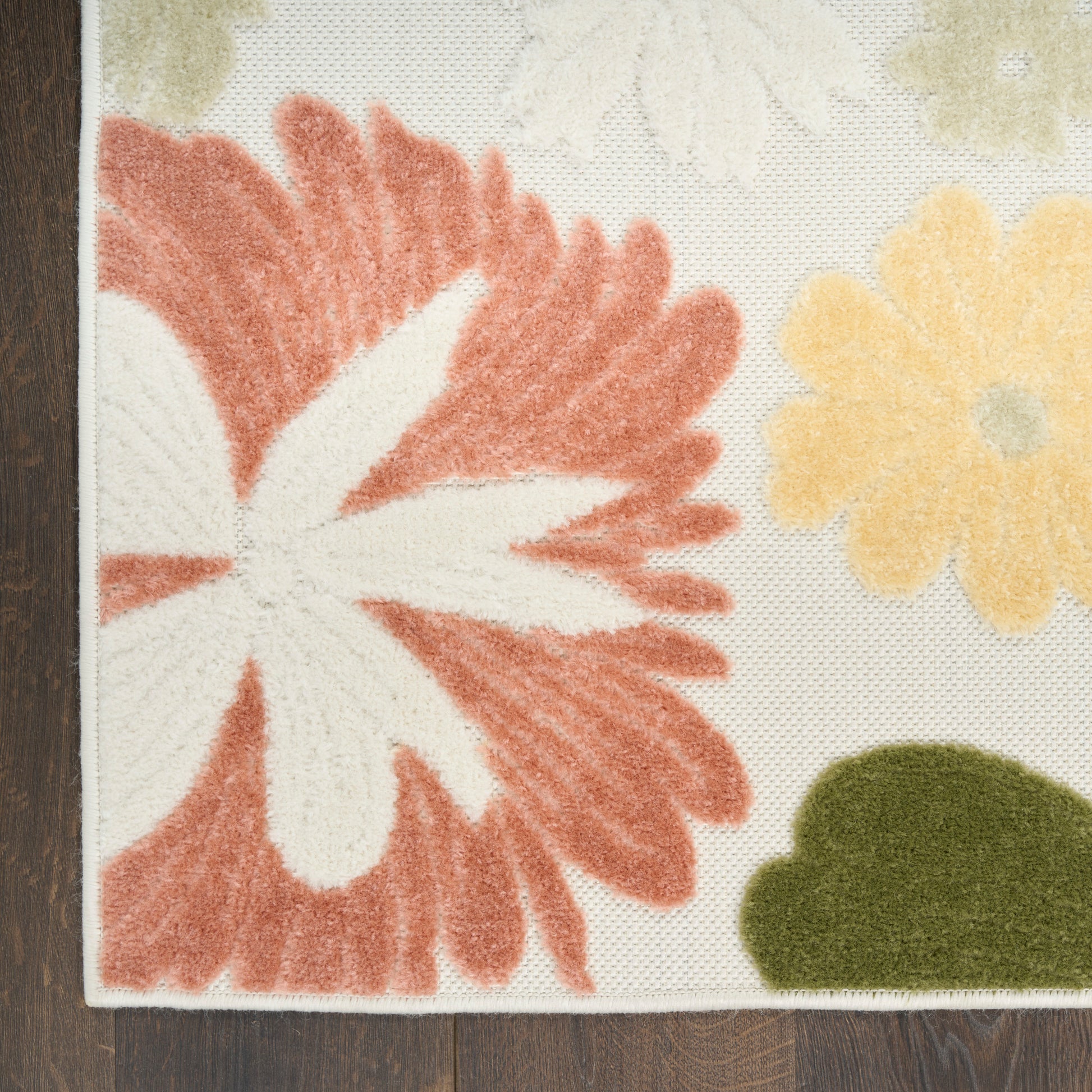 Bring a fresh and inviting burst of pattern to any space with this multicolored outdoor rug from the Aloha Collection. The oversized floral pattern, enhanced by a high-low dimensional pile, creates a cheerful focal point for patio conversation areas and living rooms alike. This colorful rug is both stylish and functional in a 100% polypropylene construction that’s easy to clean, making it ideal for busy households with kids and pets.