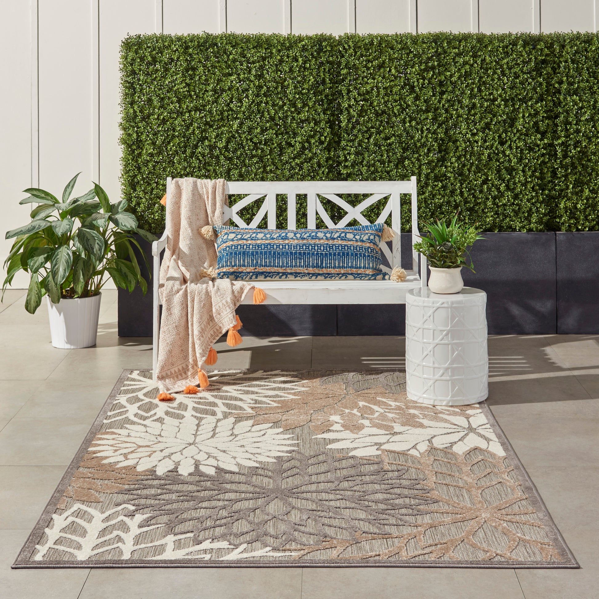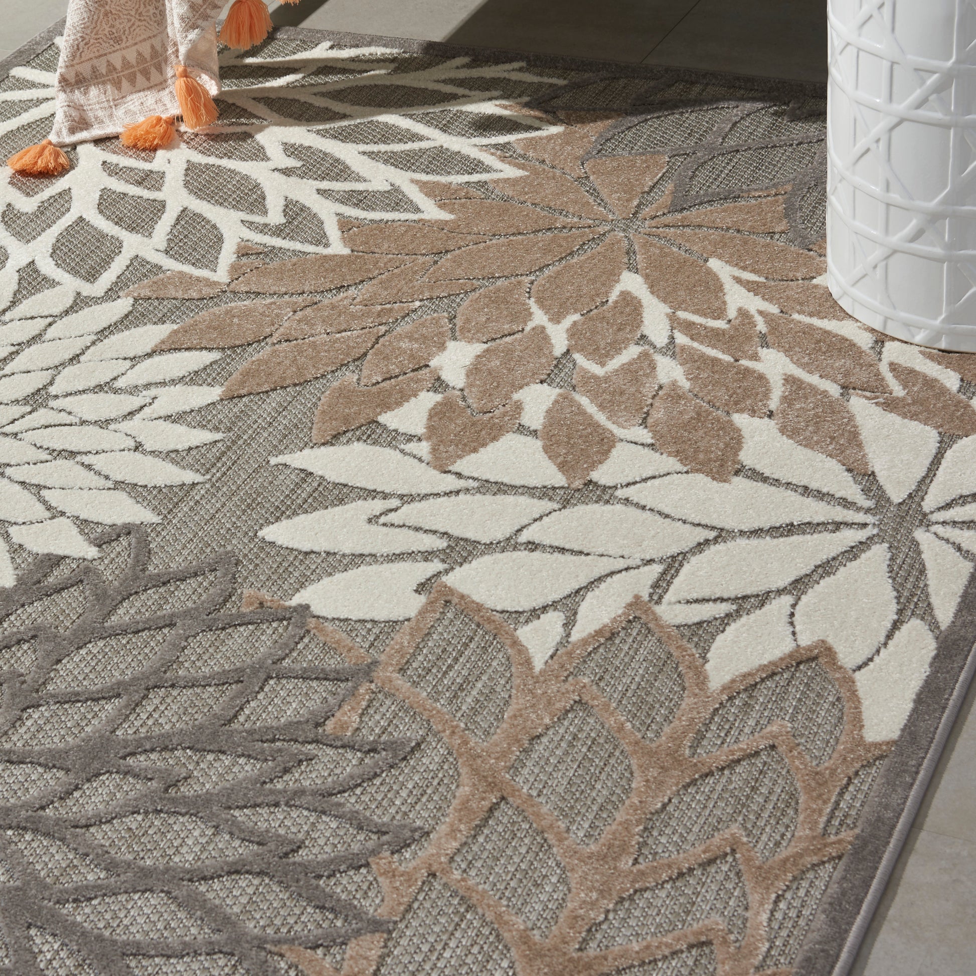 In soft shades of beige, taupe, ivory, and grey, this Aloha outdoor rug brings extra life and excitement to your patio, deck, or poolside. Its high-low construction combines delightful texture with an intricately woven base for an exceptional look and feel that stands up to the elements. This rug is machine-made from premium stain-resistant fibers that are easily washable with a hose: simply rinse and allow both sides time to fully air dry. To extend the life of your rug, bring indoors during extreme weather.