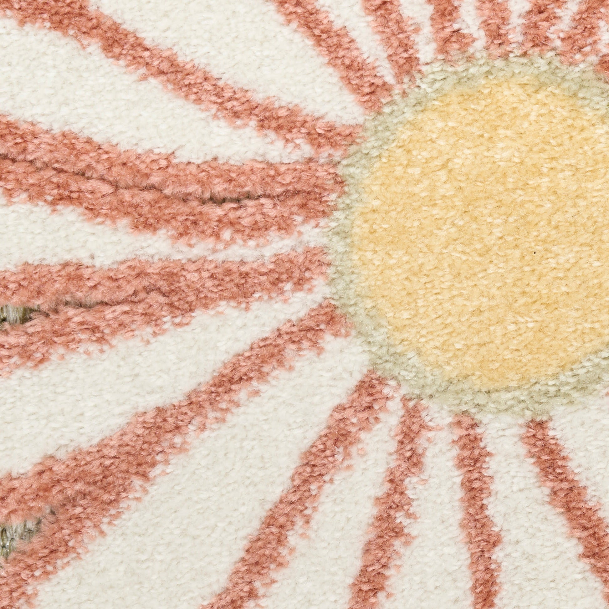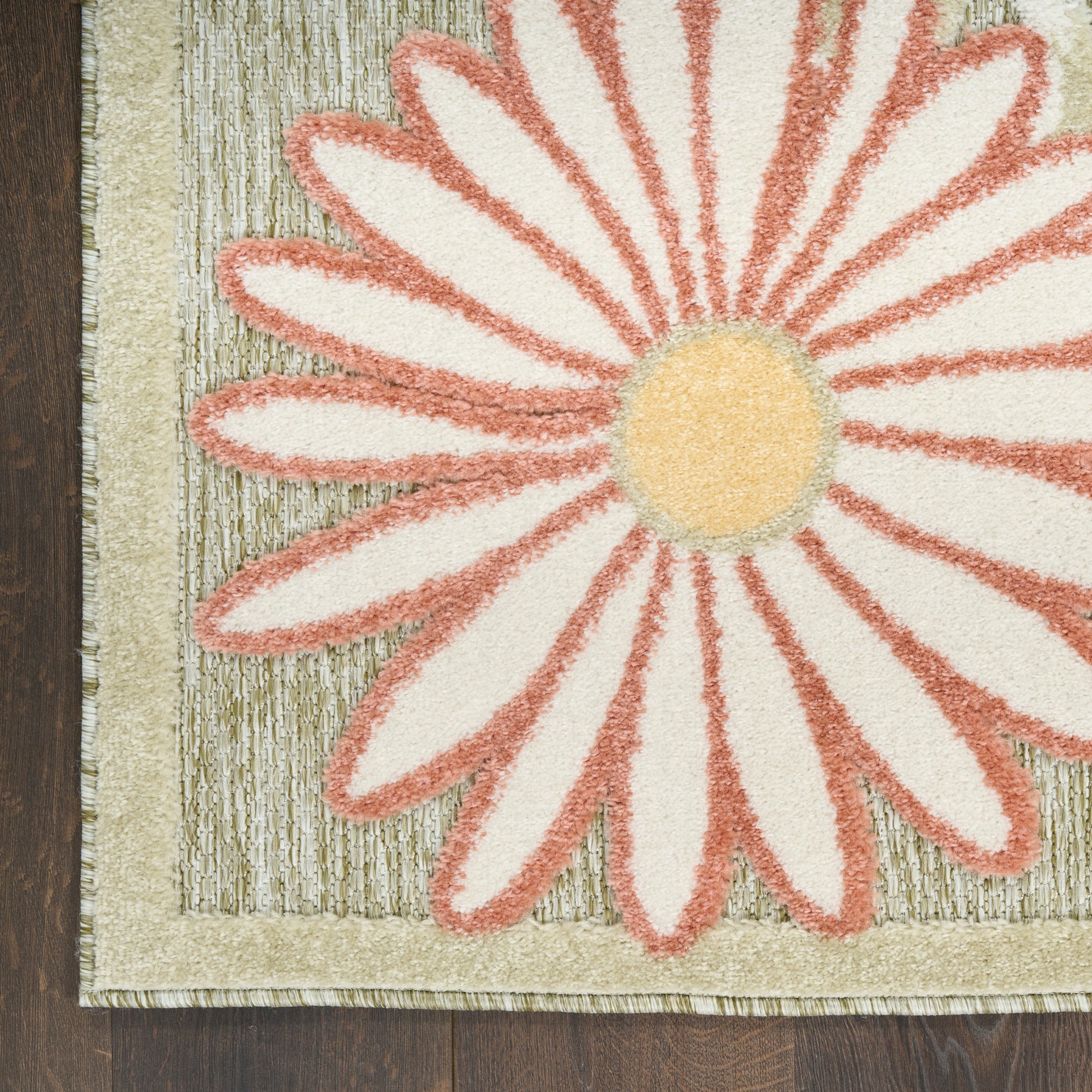 Bring a touch of nature to your floors with this sage, rose, and yellow floral outdoor rug from the Aloha Collection. The oversized daisy pattern truly pops thanks to a subtly raised finish that adds a surprisingly soft texture to the flatwoven surface. This contemporary rug is stylish and functional, pulling double duty as a foundation for both your indoor and outdoor spaces. Hand washable outdoors: rinse with a hose and air dry.