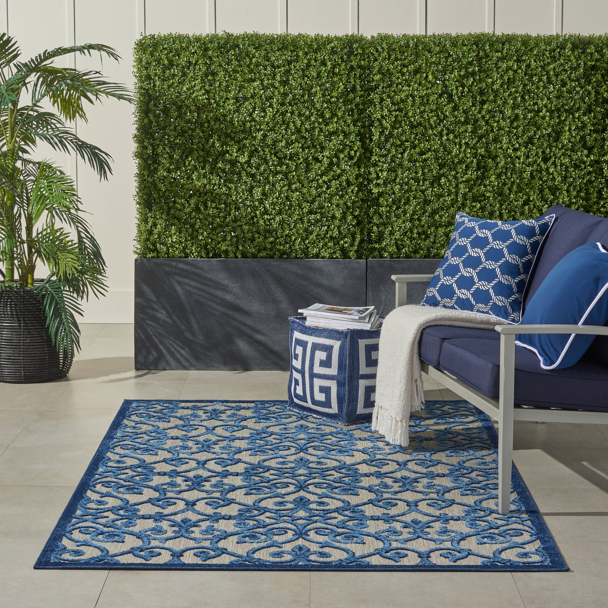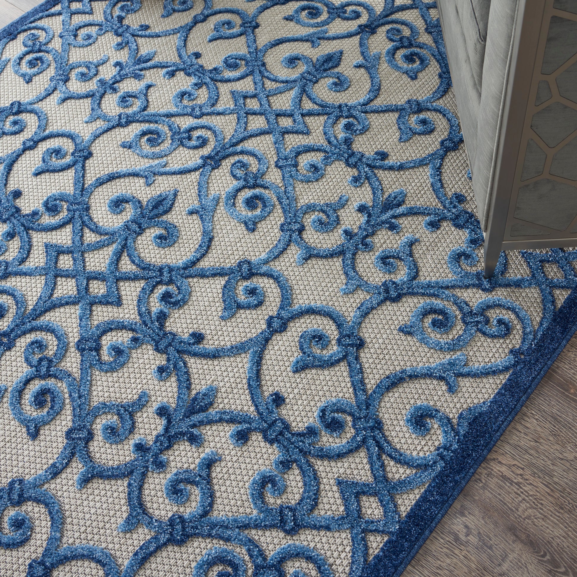 With its textural high-low style pile and scrolling floral design, this Aloha outdoor rug invites a sophisticated feel to your home. Complementary tones of navy, light blue and beige make for an elegant centerpiece for your patio or deck. Machine-made from premium stain-resistant fibers that are easily washable with a hose: simply rinse and allow both sides time to fully air dry. To extend the life of your rug, bring indoors during extreme weather.