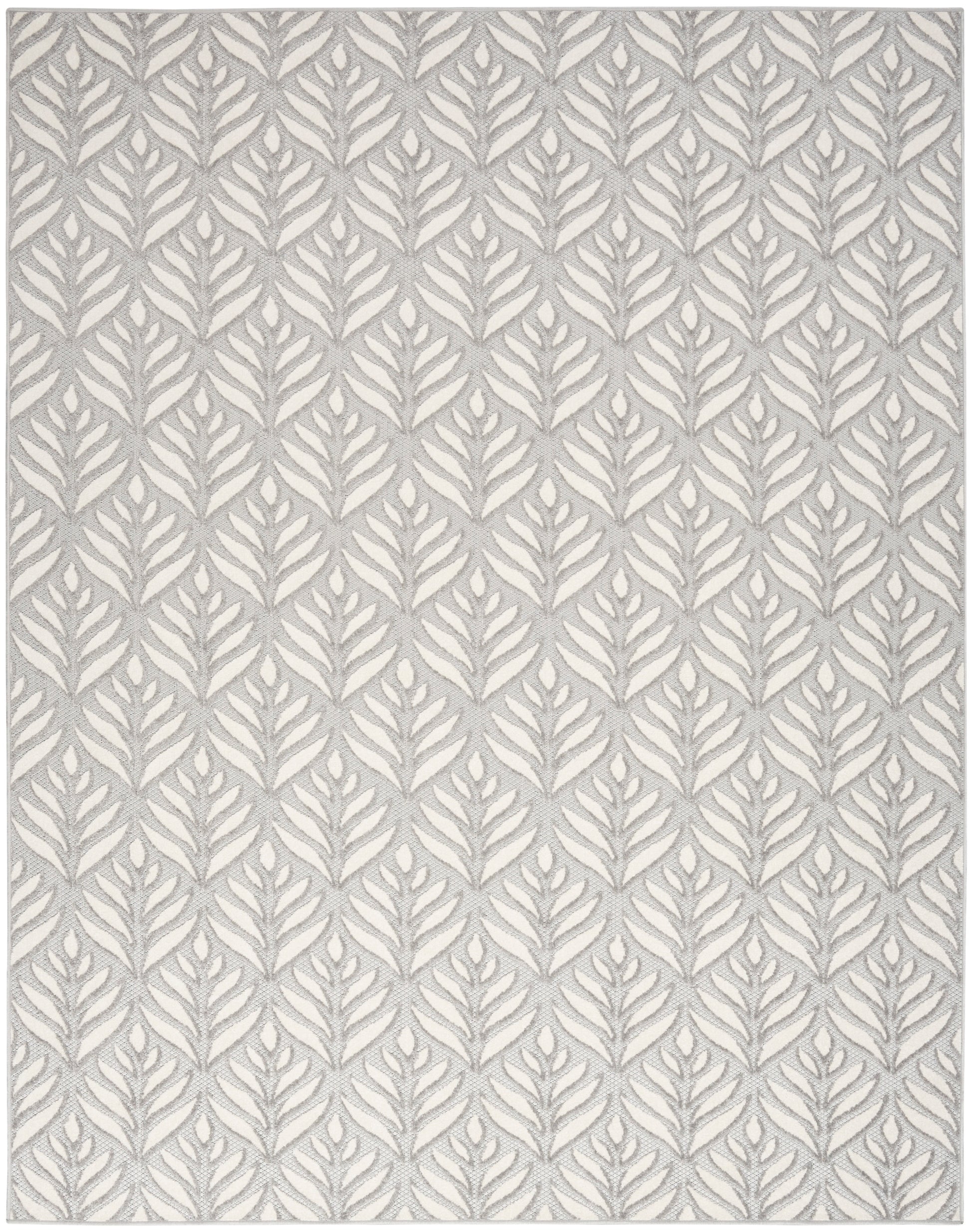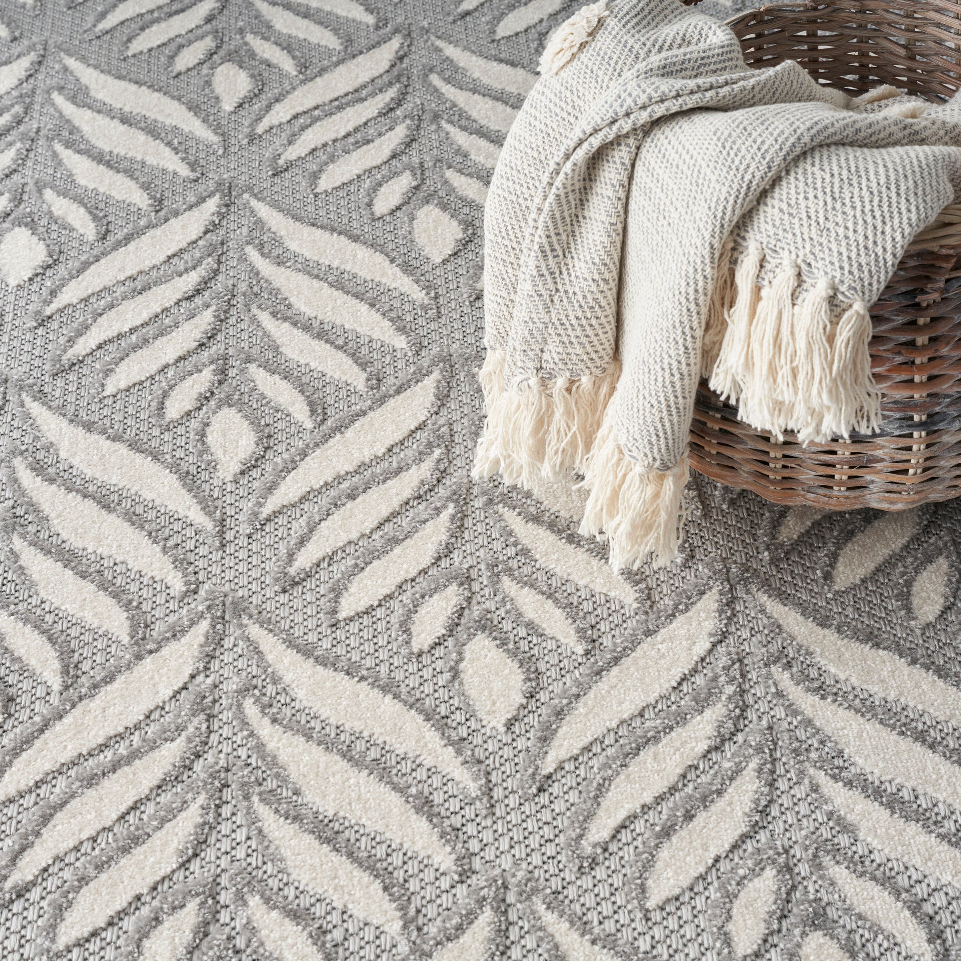 Tropical meets modern with this grey outdoor rug from the Aloha Collection. The flatwoven design is adorned with a raised, repeat palm leaf pattern that adds a subtle layer of dimension. Presented in calming colors, this botanical rug beautifully complements your patio, balcony, or deck. Made from durable polypropylene yarns that make it great for use in high-traffic indoor spaces as well, such as your kitchen, dining room, and living room. Hand washable outdoors: rinse with a hose and air dry.