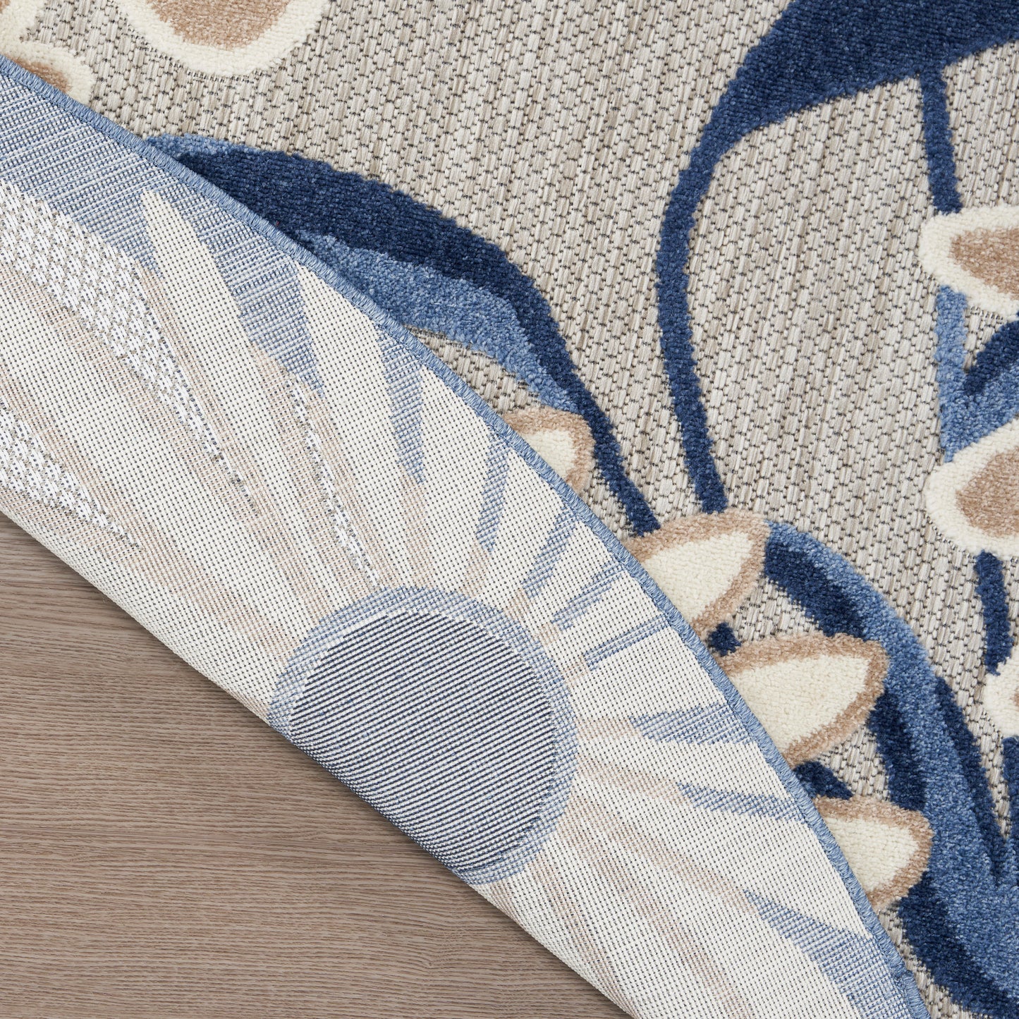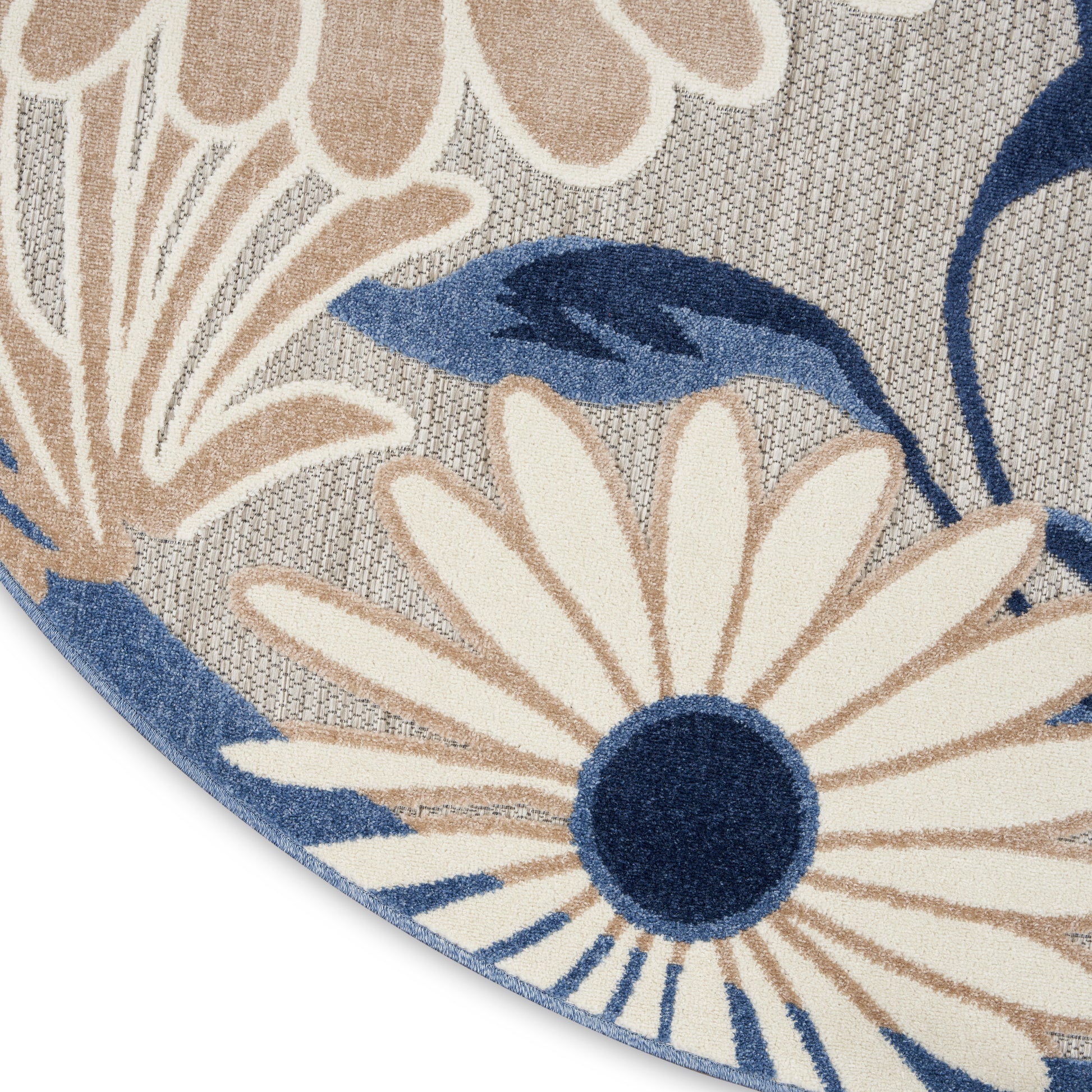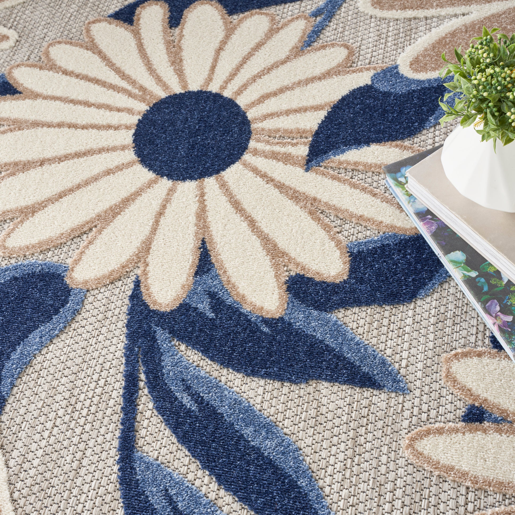 Bring a touch of nature to your floors with this blue and grey floral outdoor rug from the Aloha Collection. The oversized daisy pattern truly pops thanks to a subtly raised finish that adds a surprisingly soft texture to the flatwoven surface. This contemporary rug is stylish and functional, pulling double duty as a foundation for both your indoor and outdoor spaces. Hand washable outdoors: rinse with a hose and air dry.