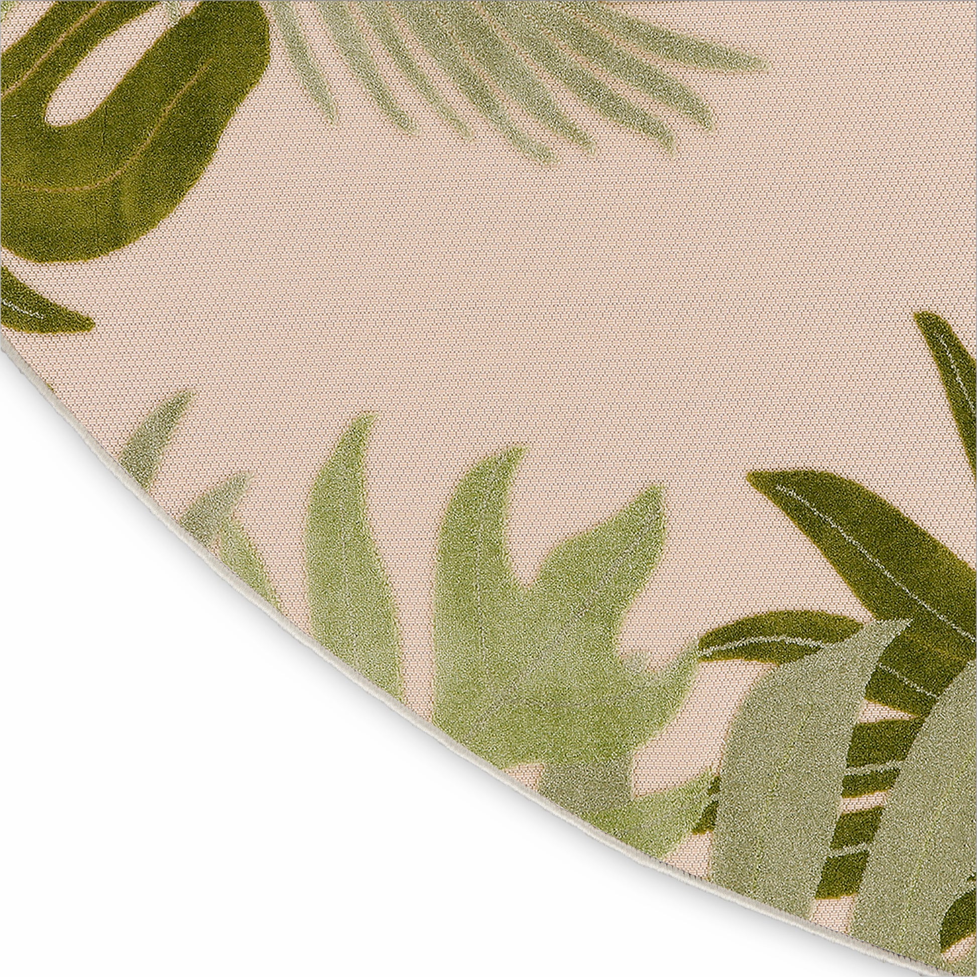 Create your own tropical escape with this green outdoor rug from the Aloha Collection. Oversized palm leaves instantly uplift your surroundings with warm and sunny vibes, while a high-low weave adds soft bursts of texture that feel amazing underfoot. Made from durable, stain-resistant polypropylene that’s easily washable outdoors: simply hose rinse and air dry. Ideal for use both inside and outside the home. Hand washable outdoors: rinse with a hose and air dry.