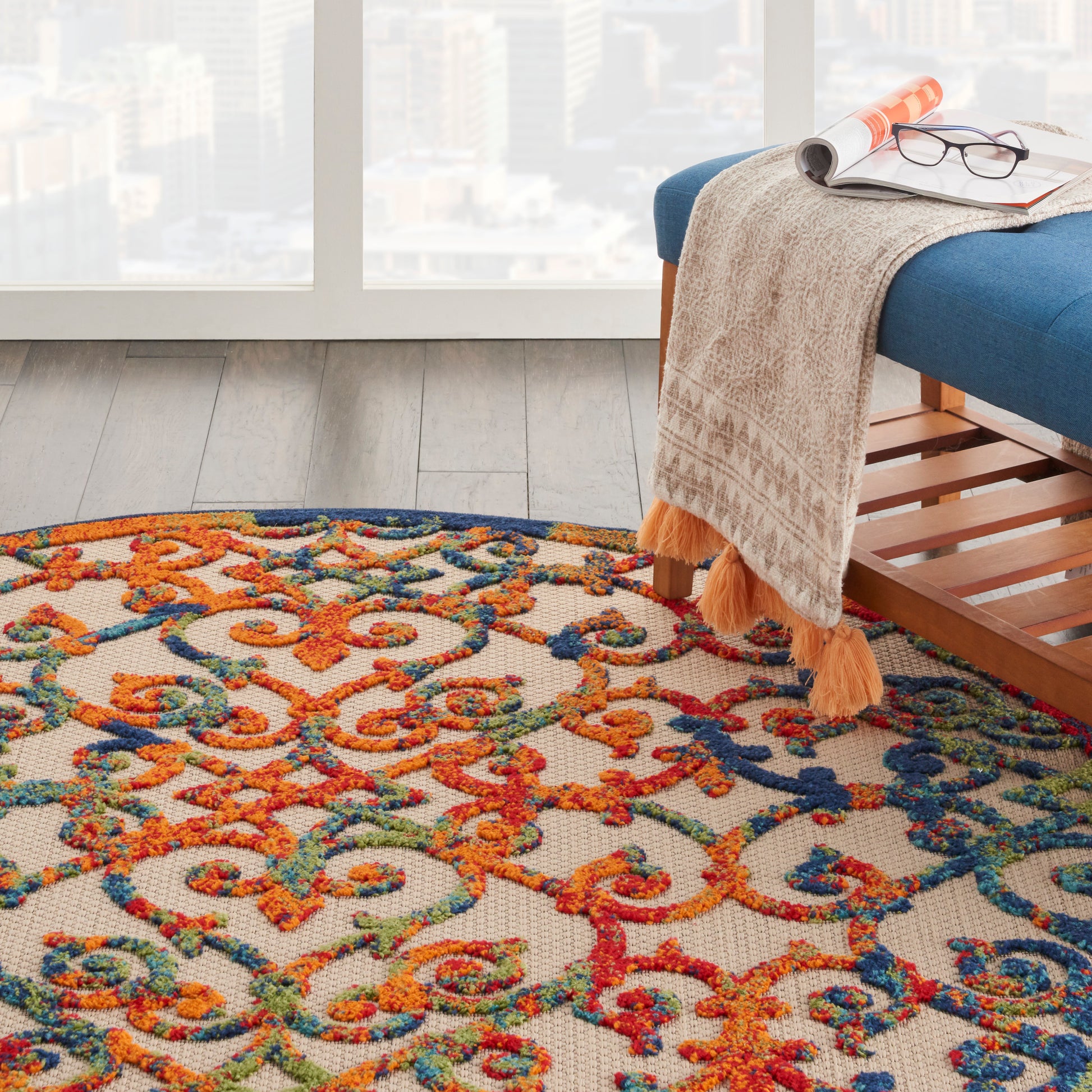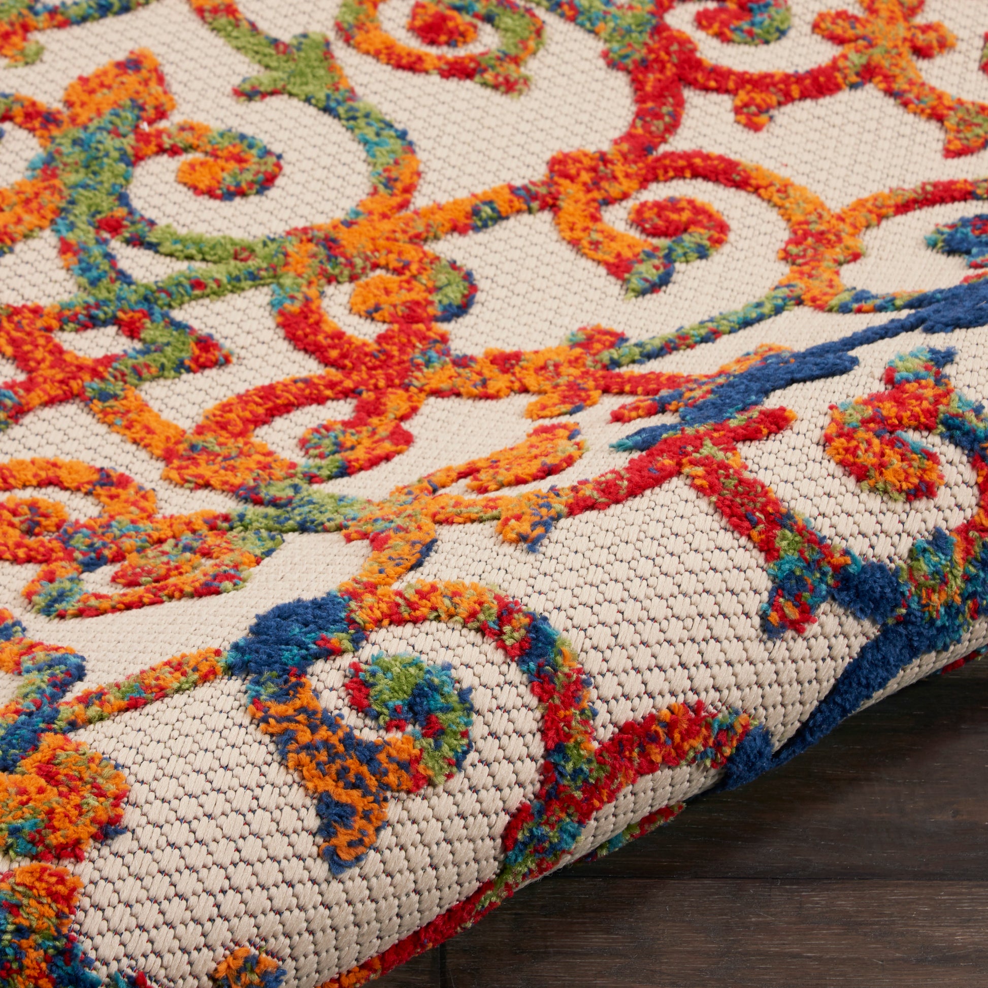 With its textural high-low style pile and scrolling floral design, this Aloha outdoor rug invites a sophisticated feel to your home. Vibrant multicolored orange, green, blue, and red hues on an ivory ground makes this rug a colorful centerpiece for your patio or deck. Machine-made from premium stain-resistant fibers that are easily washable with a hose: simply rinse and allow both sides time to fully air dry. To extend the life of your rug, bring indoors during extreme weather.