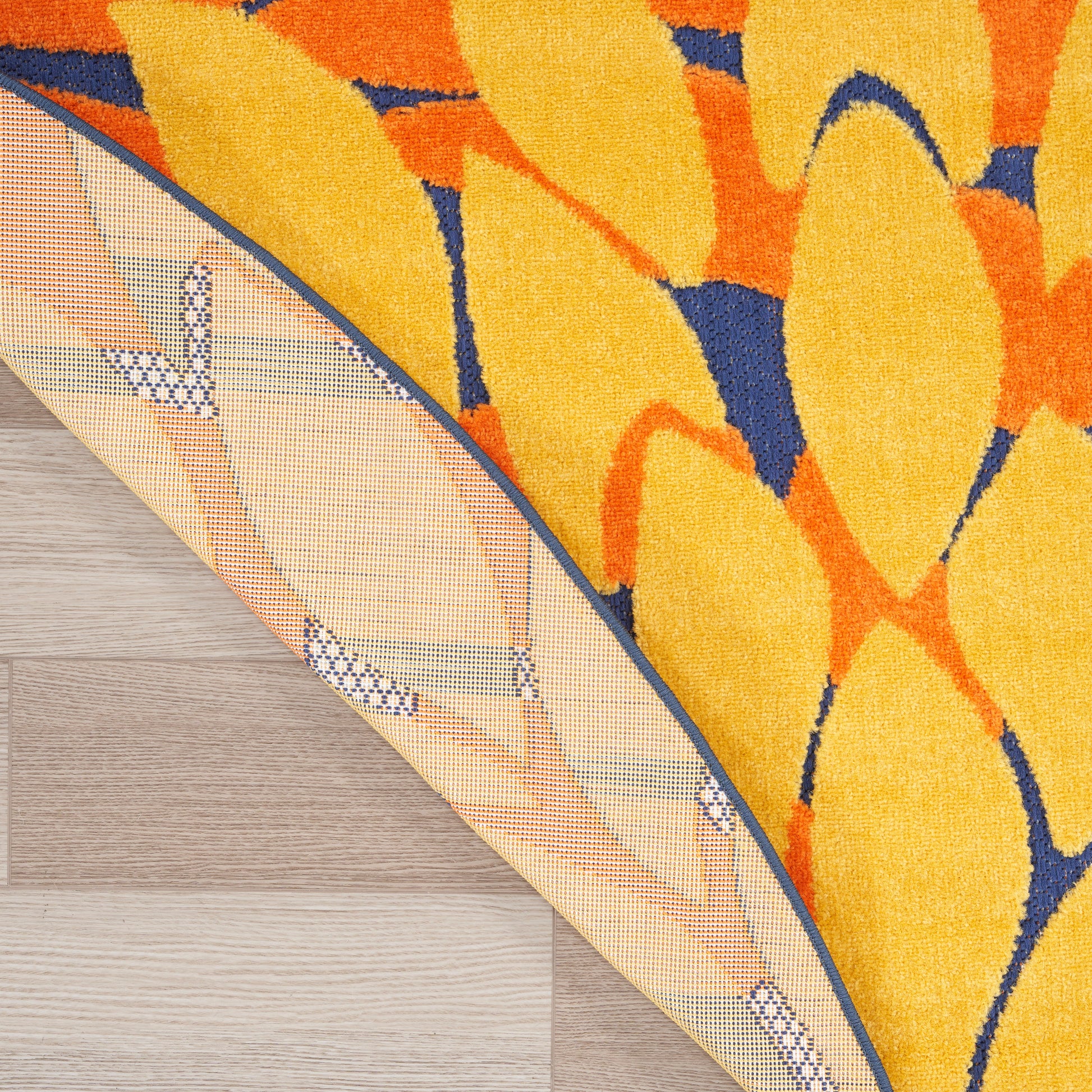 Bring extra life and excitement to your patio, deck, or porch with this Aloha floral outdoor rug. The high-low construction, presented in vibrant shades of orange, green, red, blue, and yellow, combines delightful texture with a woven base for an exceptional look and feel. This rug is machine-made from premium stain-resistant fibers that are easily washable with a hose: simply rinse and allow both sides time to fully air dry. To extend the life of your rug, bring indoors during extreme weather.