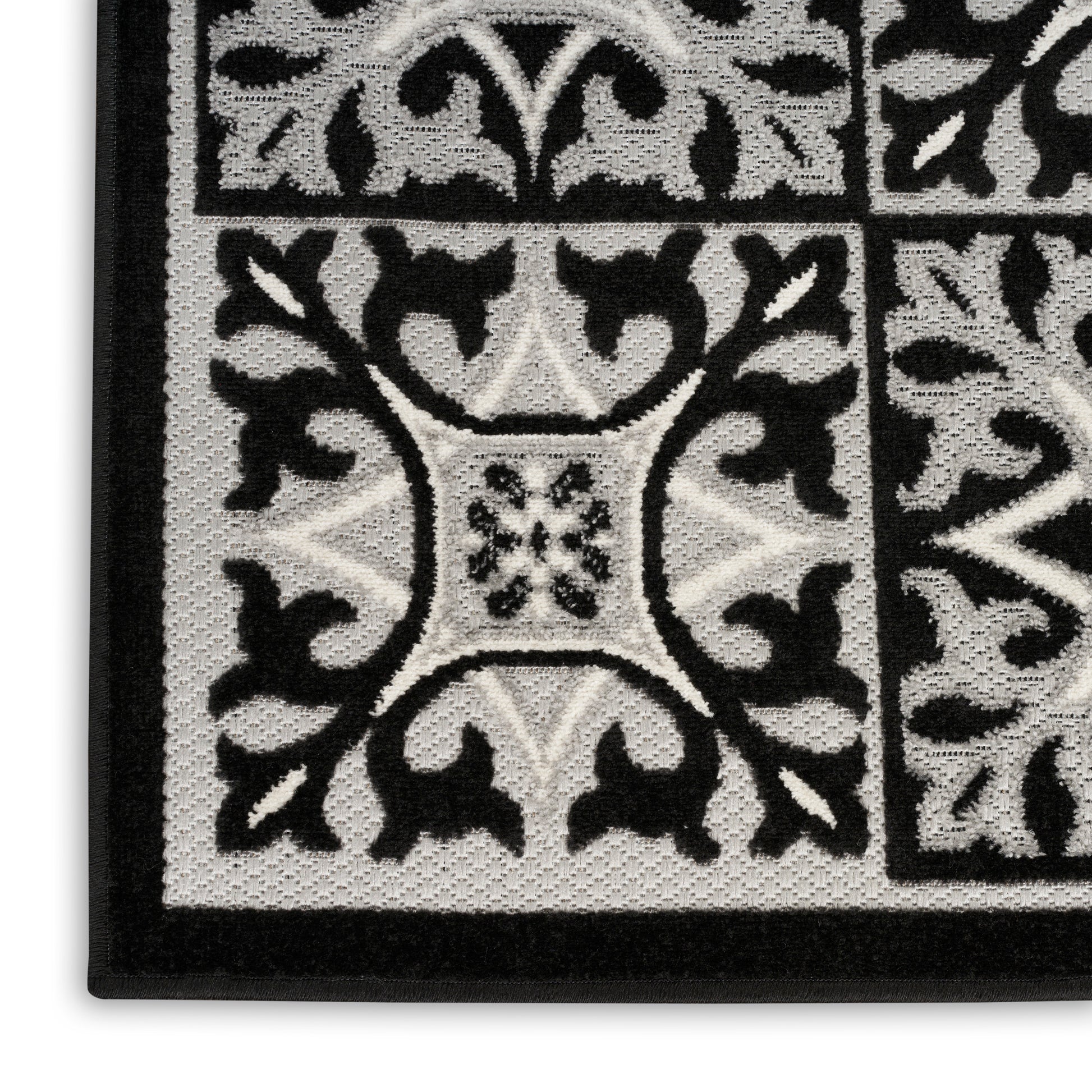 This Aloha outdoor rug brings together the best of two worlds: the classic charm of patterned tile and the warmth of an area rug! Featuring an ornate geometric pattern in black and white, this contemporary rug offers a quick and easy alternative to laying down tile. Created from premium stain-resistant fibers for long wear and low maintenance – perfect for use in both indoor and outdoor spaces such as the living room, kitchen, dining room, patio, porch, or deck. Hand washable outdoors: rinse with a hose and air dry.