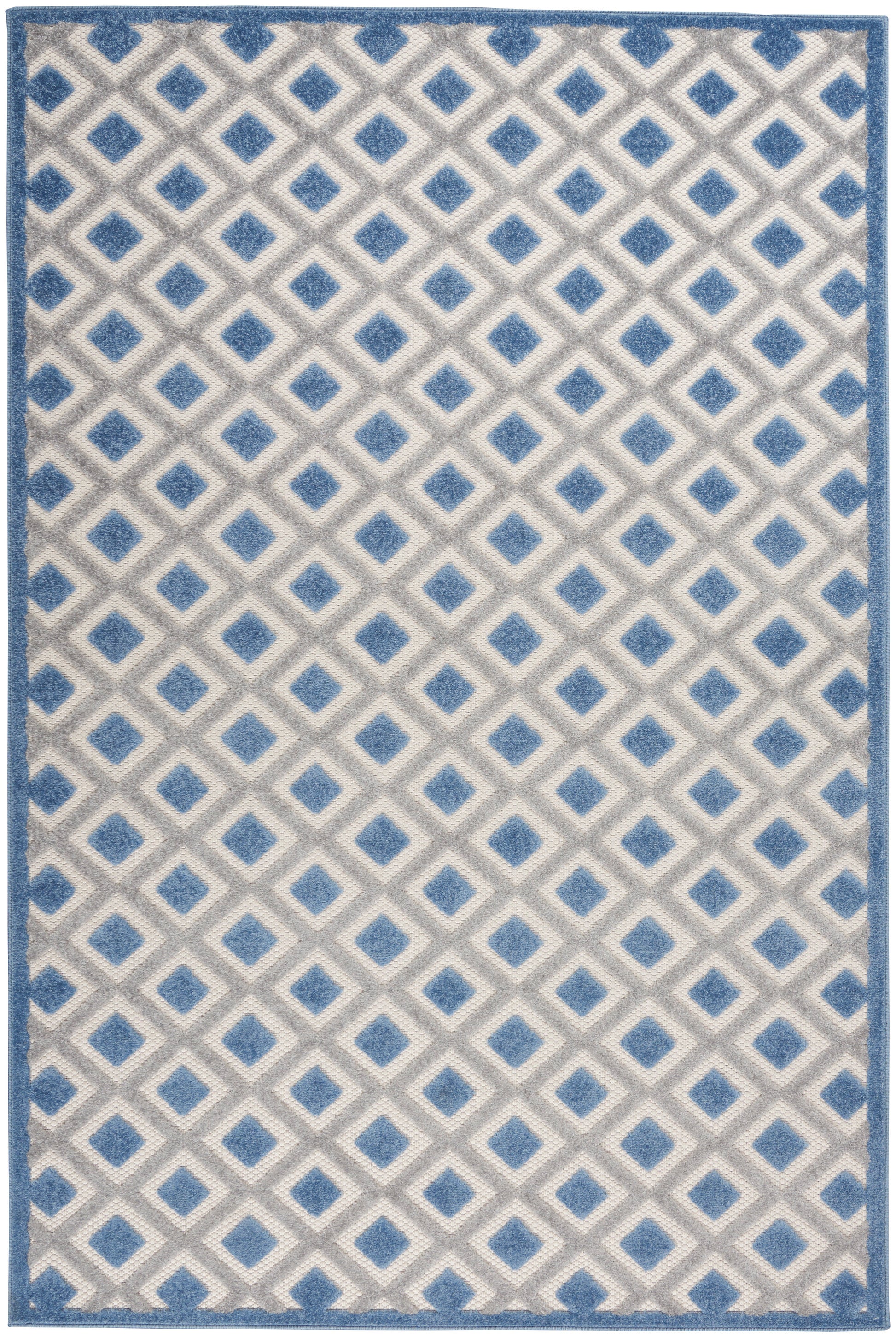 Introduce texture and pattern to your porch or deck with ease with this outdoor rug from the Aloha Collection. Simple in its sophistication, it features an all-over concentric diamond motif with a simple border in grey, blue, and ivory tones that work beautifully in modern and contemporary settings. Made from premium stain resistant fibers for durability and ease of cleaning. Hand washable outdoors: rinse with a hose and air dry.