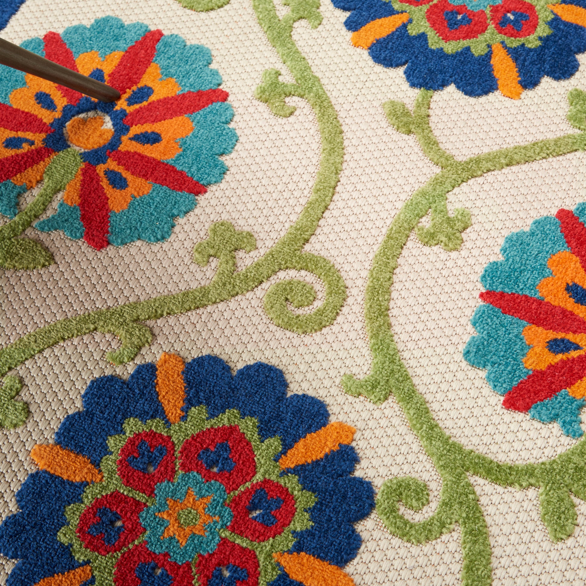 Bring a bright and sunny vibe to your patio or deck with this outdoor rug from the Aloha Collection. Floral blooms and vines in blue, green, and orange multicolor are woven onto a base of ivory in a high-low style that offers an intriguing textural effect. This colorful outdoor rug is machine made from premium stain-resistant fibers for premier durability and easy care. Hand washable outdoors: rinse with a hose and air dry.